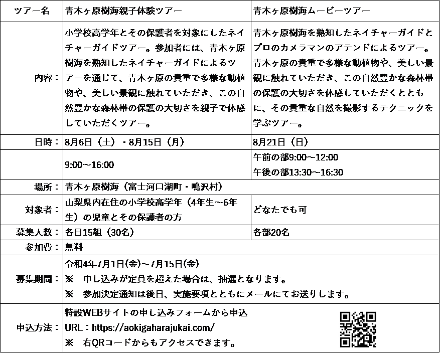 山梨県(知事:長崎幸太郎)では、富士山の裾野に広がる青木ヶ原樹海(山梨県富士河口湖町、鳴沢村)を舞台に、溶岩流の上に広がる原生的な自然環境を有するこの自然豊かな樹海の美しさと、国の天然記念物にも指定されているこの地域の保護の大切さを体感していただき、樹海の美しい景観を未来につなげていくため、青木ヶ原樹海ネイチャーガイドツアーとして、山梨県内在住の小学校高学年の児童とその保護者の方を対象とした「青木ヶ原樹海親子体験ツアー」と県内外のどなたでも参加可能な「青木ヶ原樹海ムービーツアー」を令和4年8月に開催いたします。あわせて「未来へつなぐ、青木ヶ原樹海のかがやき」をテーマに、「樹海 THE MOVIE! ショートムービーコンテスト」も同時開催し、「人・自然・文化」が織りなすことで輝きを放つ青木ヶ原樹海の映像を広く募集いたします。