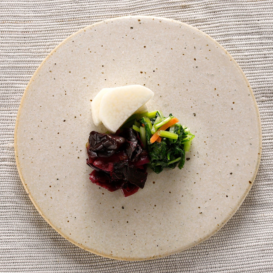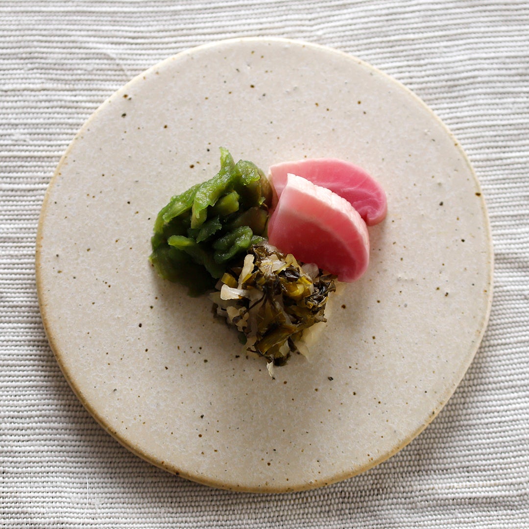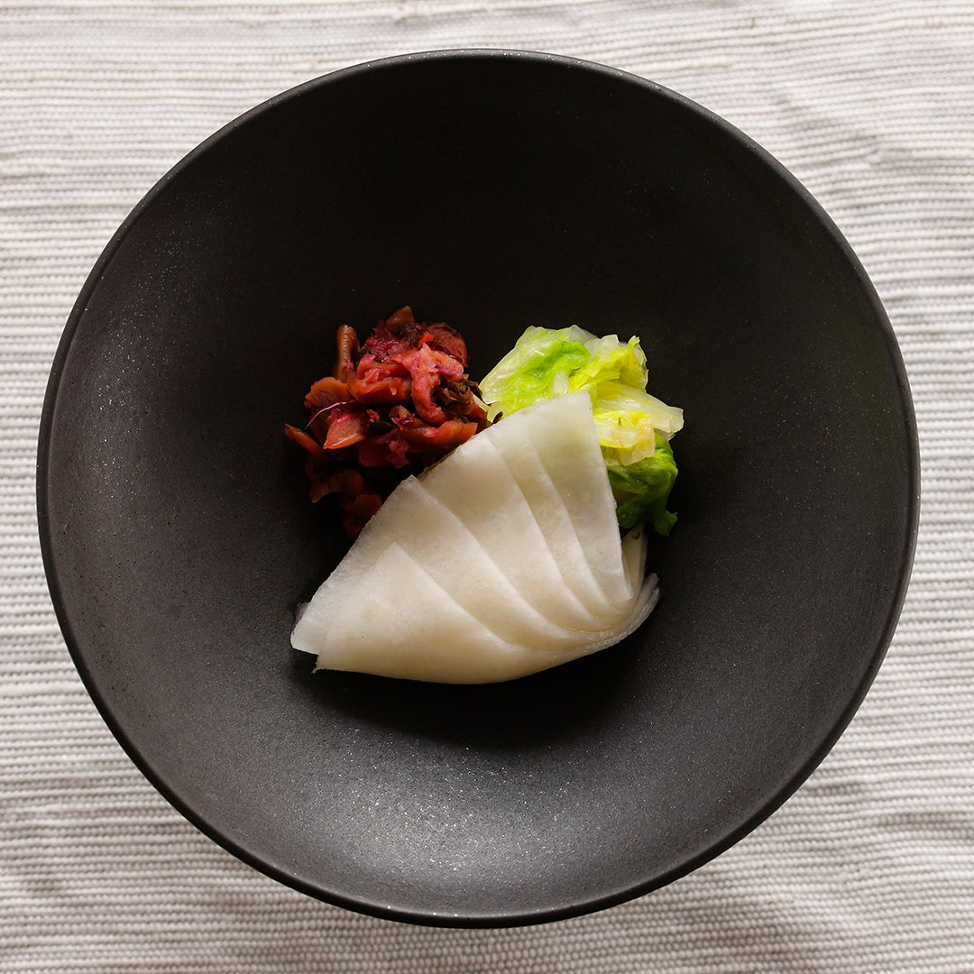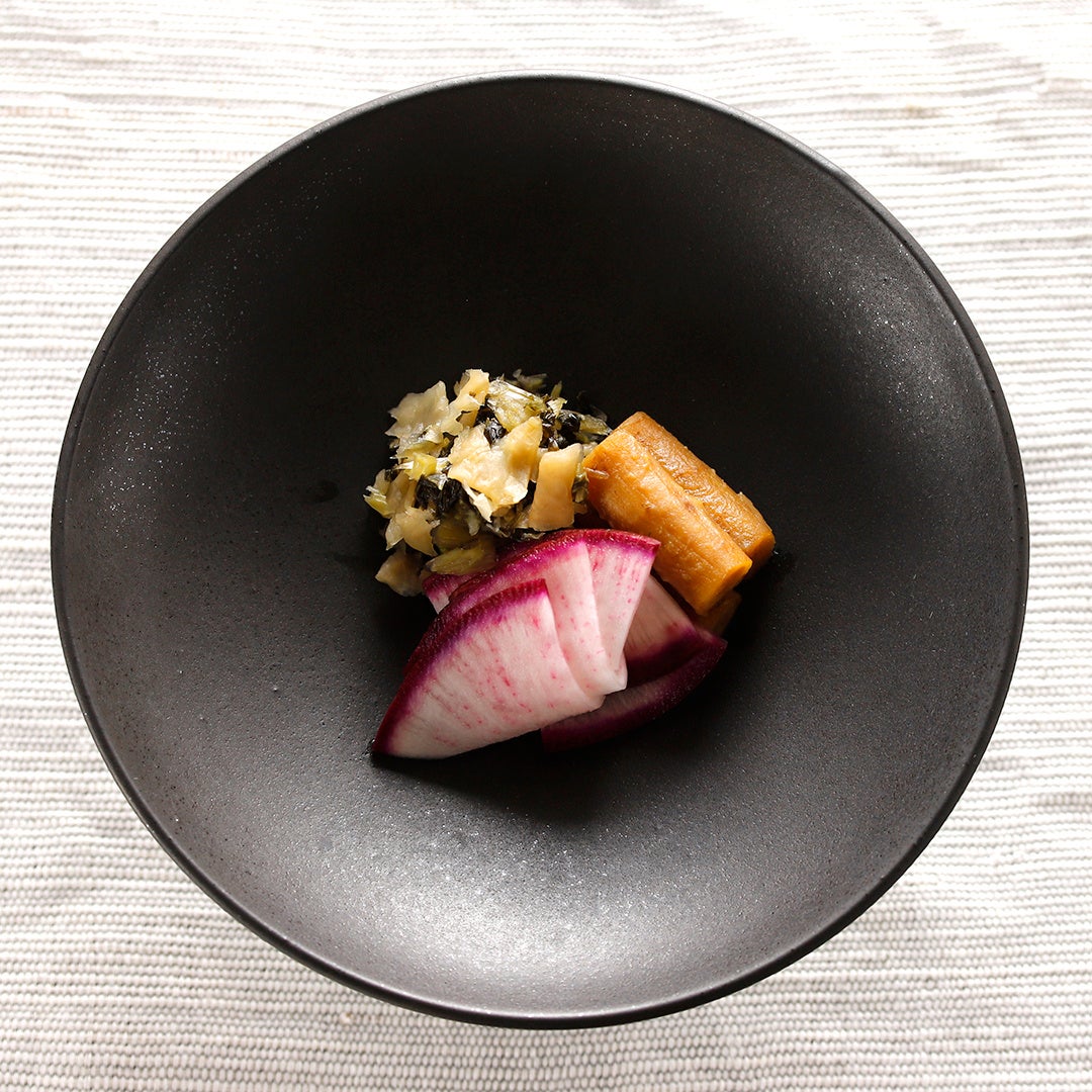 旬に採った小かぶらを糠床でじっくり熟成させ、青紫蘇、山椒の実、生姜、茗荷を加えてあっさりと仕上げています。