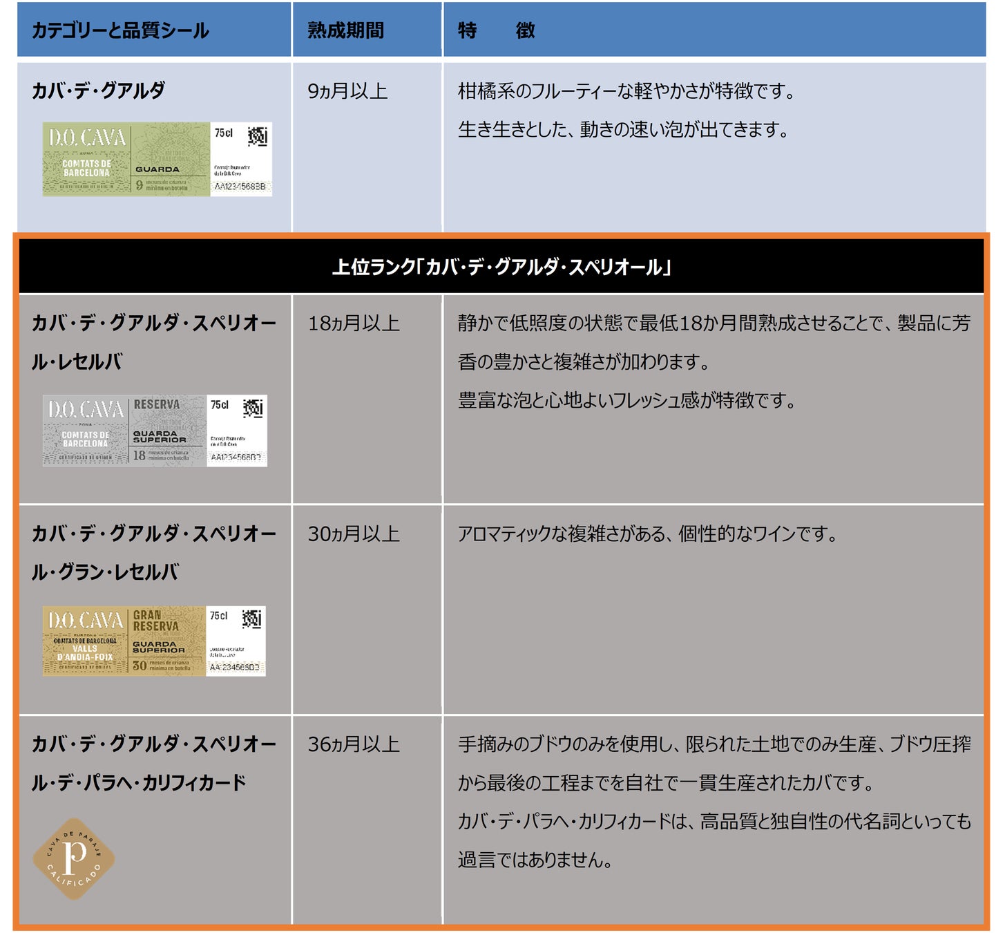 瓶内熟成期間によって、カバ・デ・グアルダ(熟成期間が最低9ヶ月)とカバ・デ・グアルダ・スペリオール(熟成期間がより長い上に、樹齢10年以上の特定の畑のヴィンテージ・カバから造られ、2025年から100%オーガニック生産)が存在します。スペリオールは、瓶内熟成期間によって3つのカテゴリーに分けられており、18ヶ月熟成のレセルバ、30ヶ月熟成のグラン・レセルバ、36ヶ月熟成のパラヘ・カリフィカード)があります。