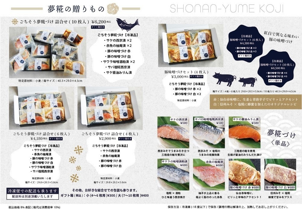 商品は単品でのご注文はもちろん、贈答用に最適な海鮮ネタを中心に、食べごたえ十分な豚の糀漬けなどが入った10枚入り・6枚入り・4枚入りの詰合せもご用意しています。湘南夢糀の「ごちそう夢糀」、夏の手土産など幅広くご利用いただけます。