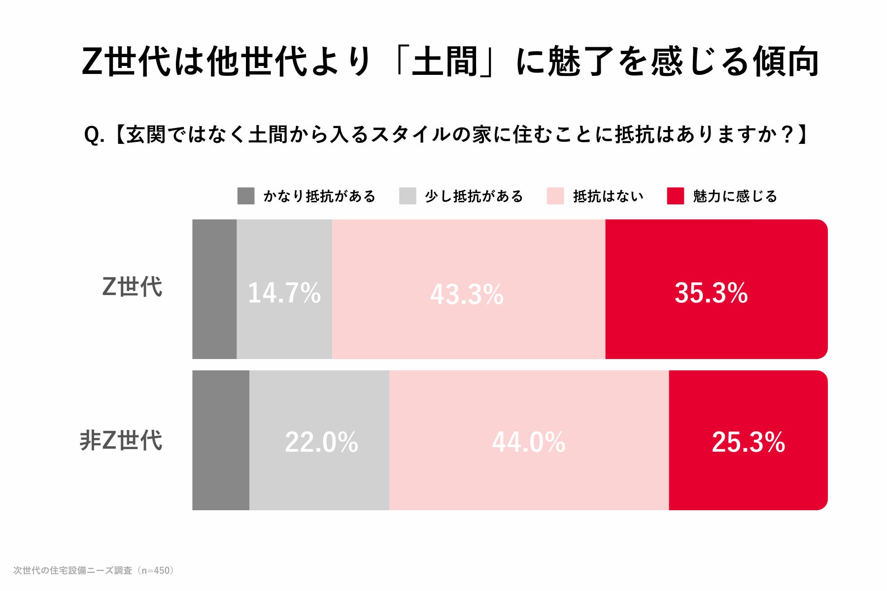 続いて、土間と玄関を一体化した土間玄関について、さらに深掘りして調査しました。「玄関ではなく土間から入るスタイルの家に住むことに抵抗はありますか?」という質問に対して、Z世代では35.3%が土間に「魅力を感じる」と回答しました。非Z世代の25.3%と比べると約1.4倍高い評価となっており、Z世代の「映え」とミニマル志向にフィットしている様子。また、全体としても73%以上が抵抗はない・魅力に感じると回答しています。