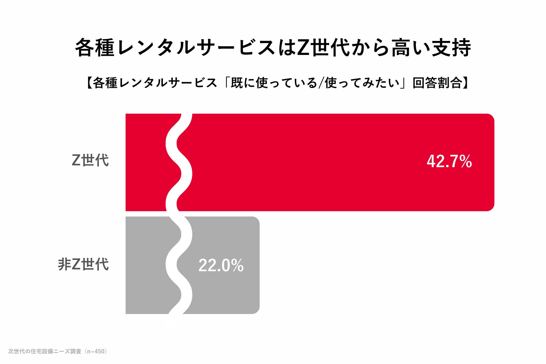これは非Z世代の22%に対して約2倍の割合であり、Z世代の「モノを所有せず、必要な時だけレンタルする」価値観が顕著に現れています。