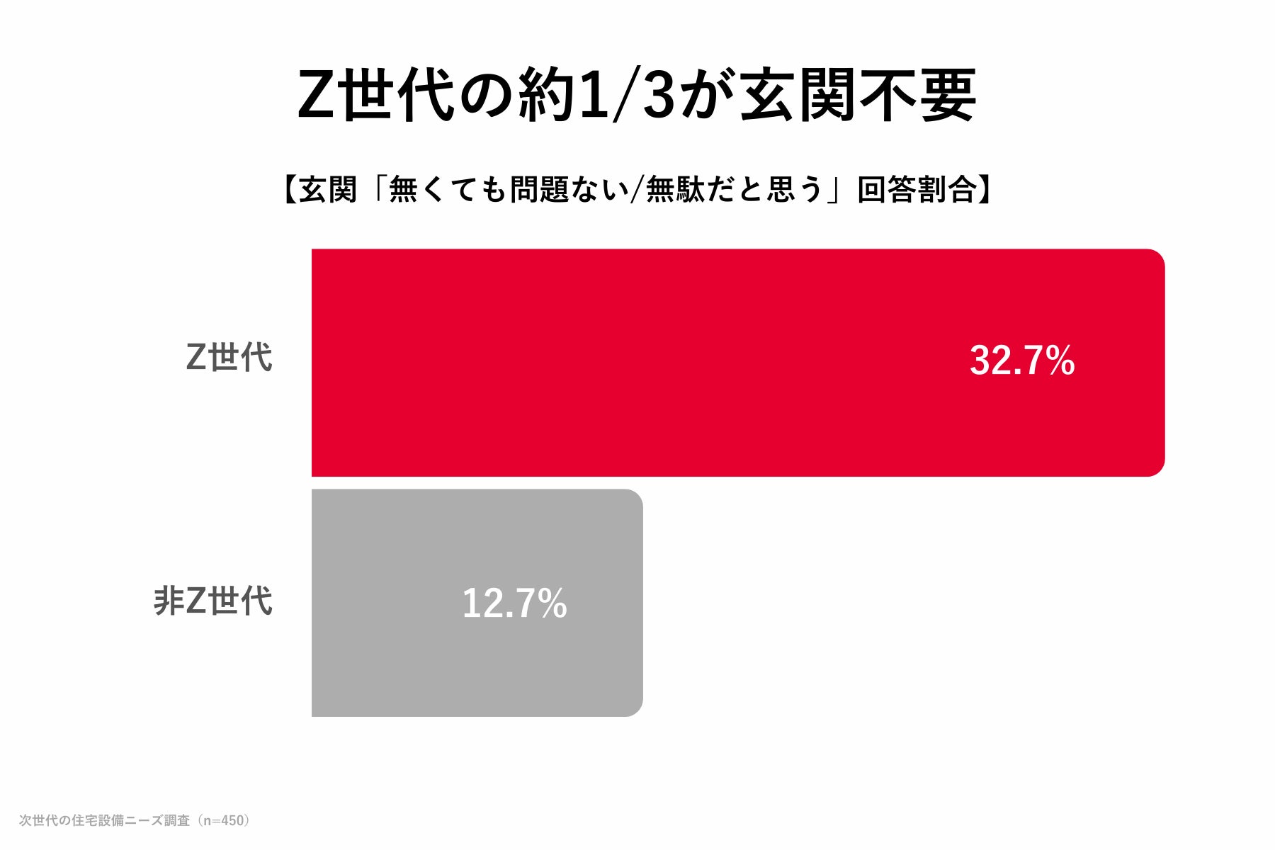 Z世代 「玄関はなくても問題ない」32.7%で非Z世代の約2.6倍。次世代の住宅設備ニーズ調査