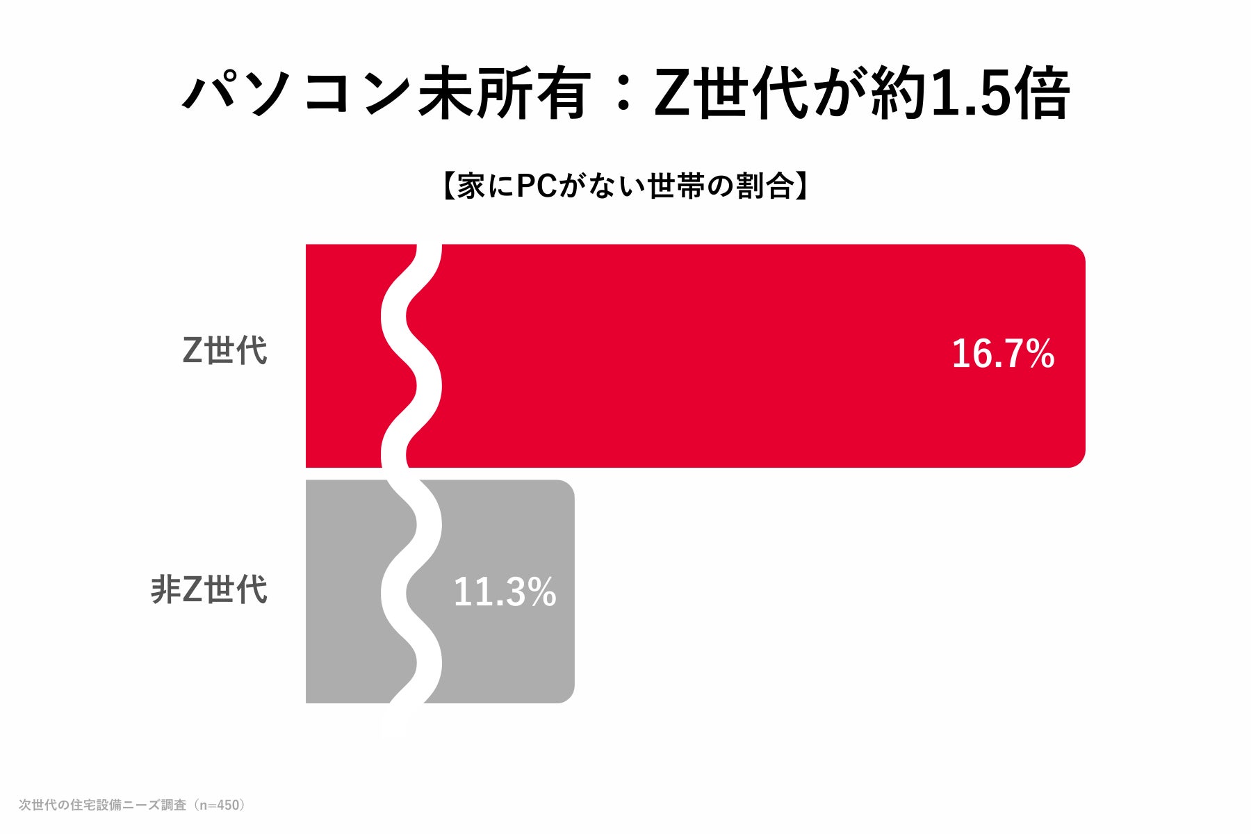 Z世代におけるPC未所有率は16.7%であり、非Z世代と比較すると約1.5倍高いことが分かりました。