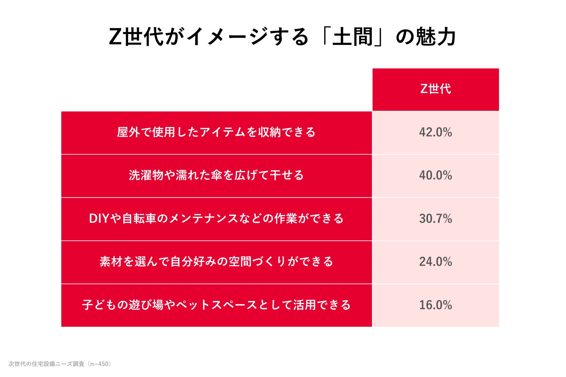 実際に、Z世代はどのような点で土間を魅力に感じているのでしょうか。まず「屋外で使用したアイテムを収納できる」(42.0%)と「洗濯物や濡れた傘を広げて干せる」(40.0%)が高い支持を得ており、屋外活動に対する利便性を評価する声が多くなりました。また、DIYや自転車のメンテナンスなど作業スペースとして活用できる点(30.7%)や、素材を選んで自分好みの空間づくりが可能な点(24.0%)も魅力と感じる意見が一定数見られました。