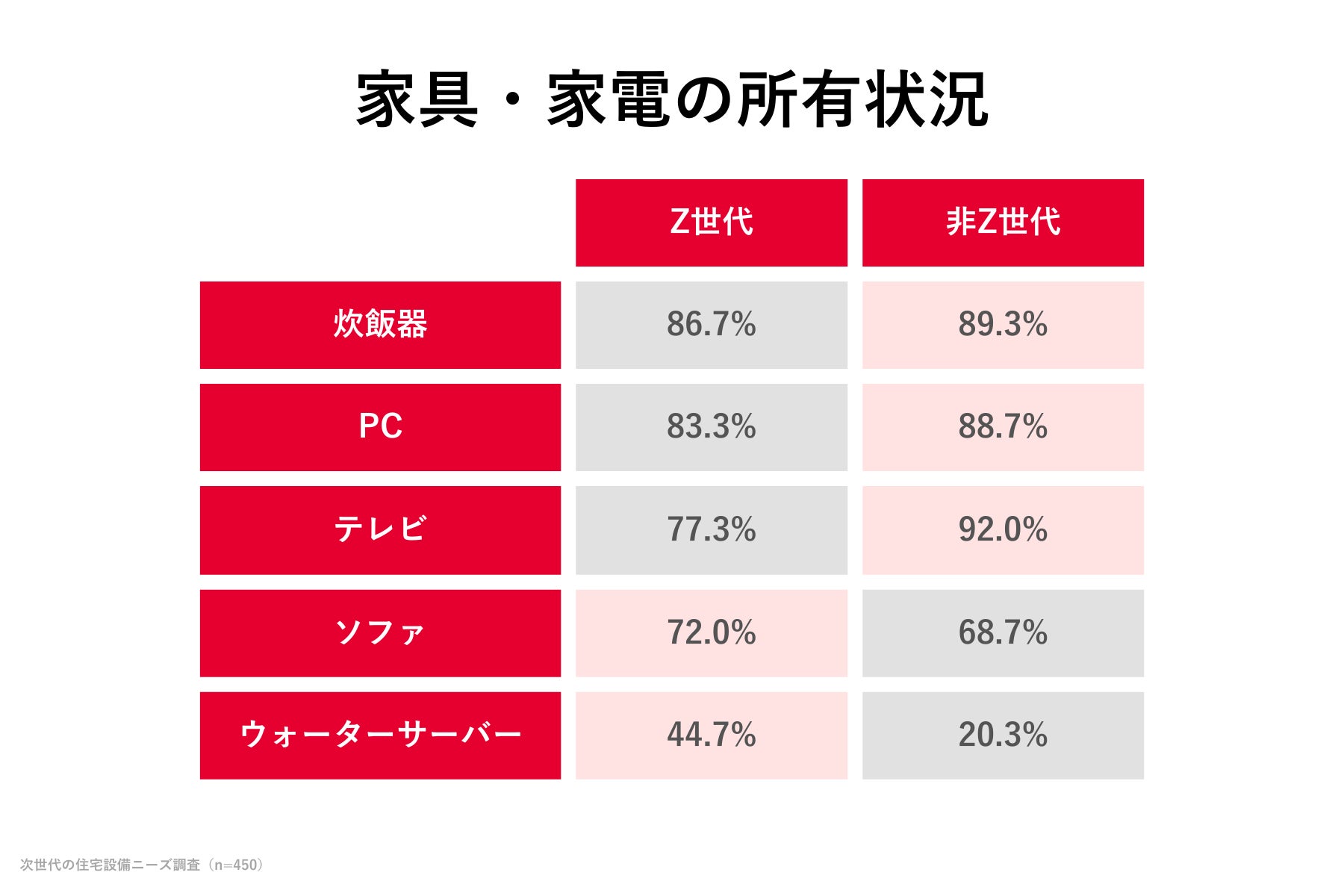 本調査では、年齢29歳以下を「Z世代」、30歳以上を「非Z世代」と定義し、世代間の住宅設備や家具・家電に対するニーズの違いを分析しました。Z世代のテレビ離れはよく知られていますが、今回はさらに家具・家電や住宅設備全般を調査範囲に含め、より幅広い視点で検証しています。