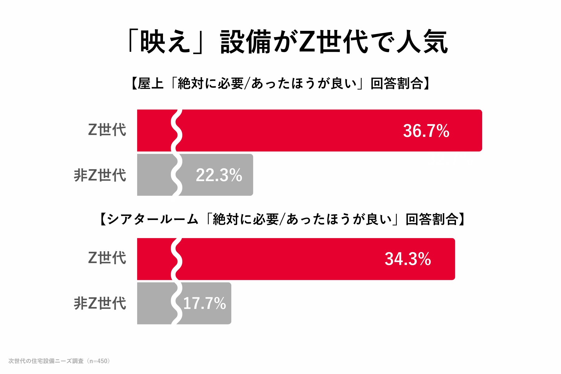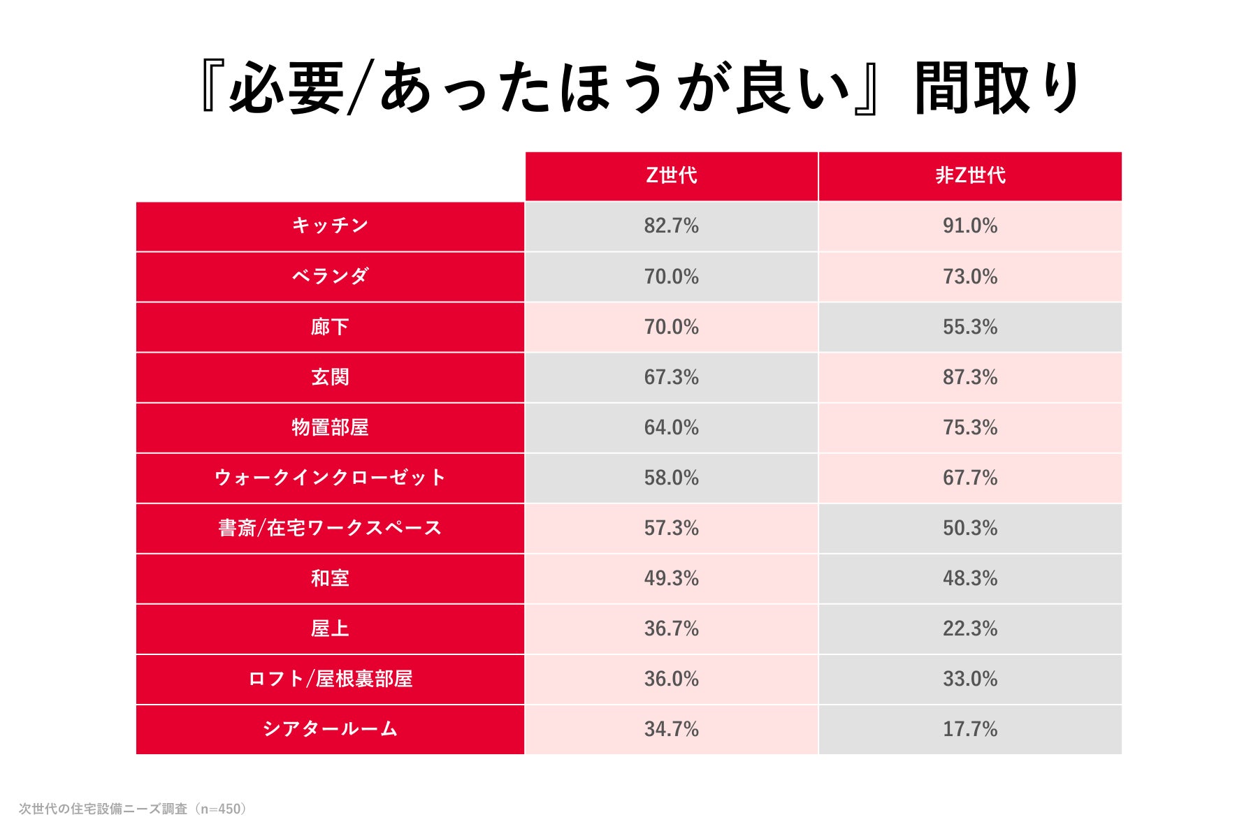 Z世代ではテレビや収納スペース、玄関について「なし派」の傾向が強く、全体的にミニマル志向の傾向が確認されました。一方で、生活必需品よりも「映え」や仲間内で楽しむための設備(例:シアタールーム、屋上、ウォーターサーバー)への関心が高まっていることがわかりました。