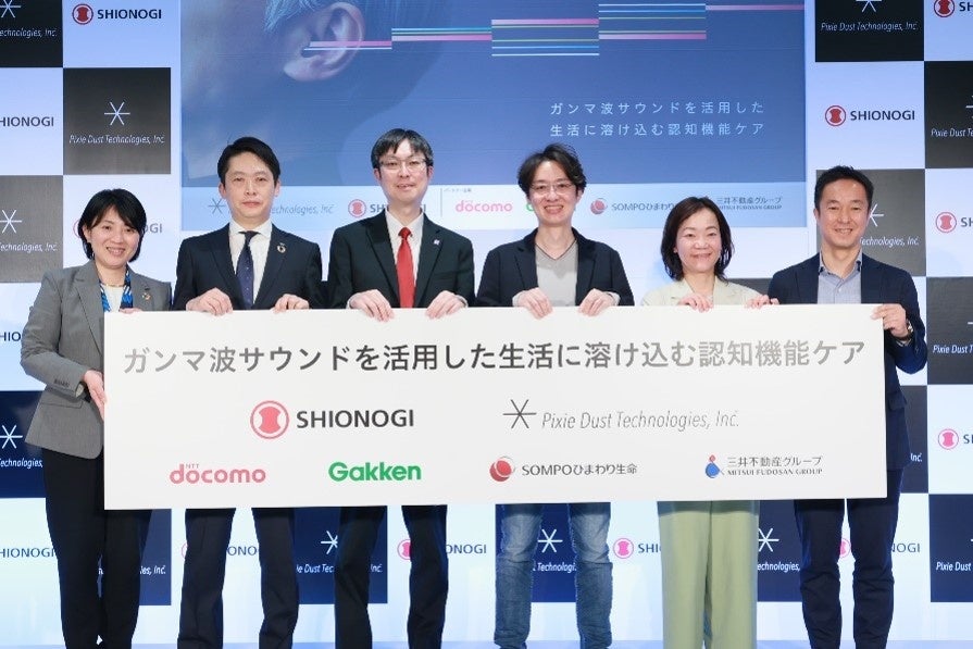 ガンマ波変調技術の研究・技術開発を進めている塩野義製薬とピクシーダストテクノロジーズ株式会社の2社が中心となり、パートナー企業として参加する株式会社NTTドコモ、株式会社学研ココファン、SOMPOひまわり生命保険株式会社、三井不動産株式会社の4社とともに、各社の事業領域の中で「ガンマ波サウンド」による認知症予防、認知機能改善の取り組みについてお話を伺いました。