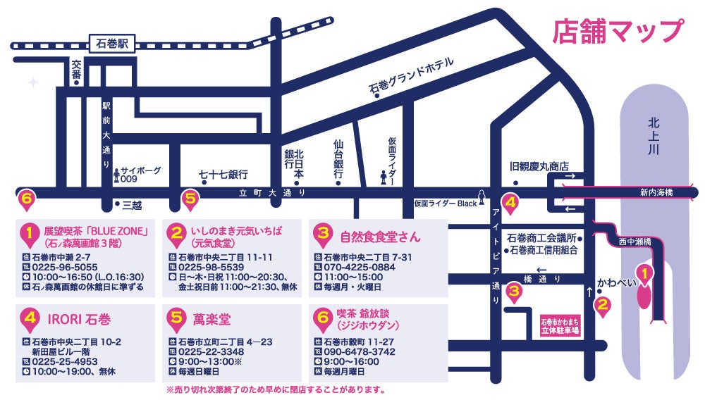 ※営業時間変更や臨時休店がある場合は各店舗SNSまたは石ノ森萬画館Twitterでお知らせいたします。