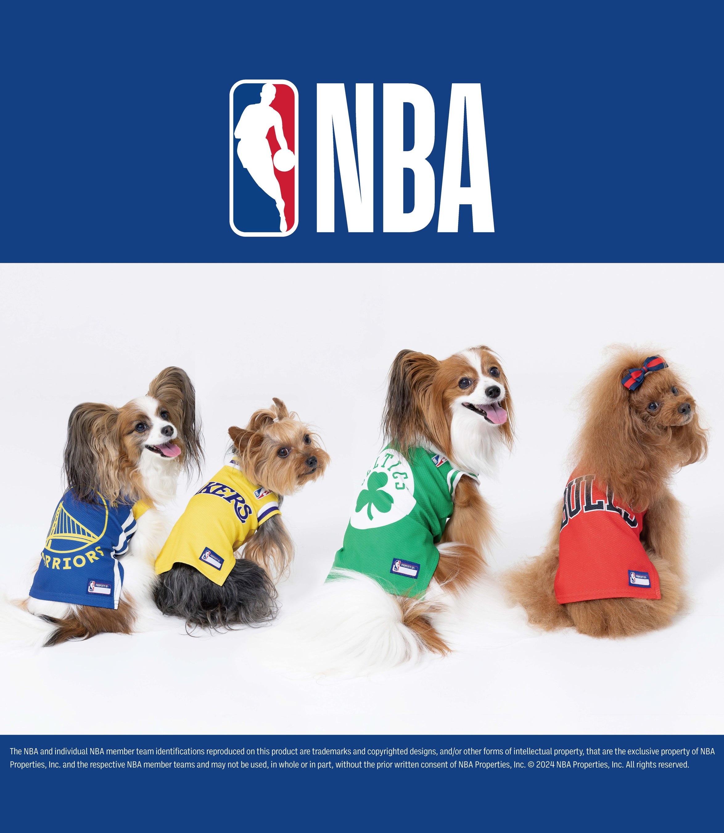 本物のバスケットボールユニフォームのような素材や質感のペット用ジャージ型ウェアやワンちゃんが寛げるベッドとバスケットボール型おもちゃが展開されます。この夏ストリートファッションとの親和性のあるNBAアイテムでワンちゃんと一緒に盛り上がろう!