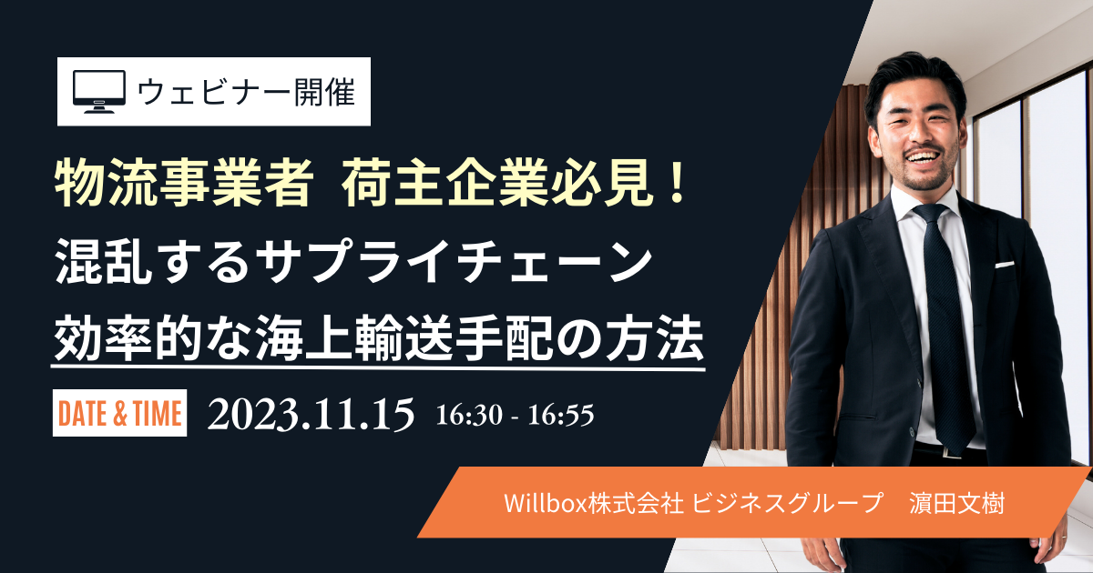 内 容:現在、海上輸送では海上運賃の低迷や製造工程の遅れ、本船の抜港など課題が尽きない状況です。そこで、Willboxはスムーズかつ柔軟に海外輸出が行えるよう、複数の船会社の海上運賃や本船スケジュールが一覧で検索〜発注ができるプラットフォーム「Container EC(コンテナ イーシー)」を開発しました。船会社のコンテナスペースをリーズナブルに直接利用することができる日本で唯一のサービスです。混乱するサプライチェーンによる荷主様、物流事業者様へ最適な課題解決方法をお伝えします。