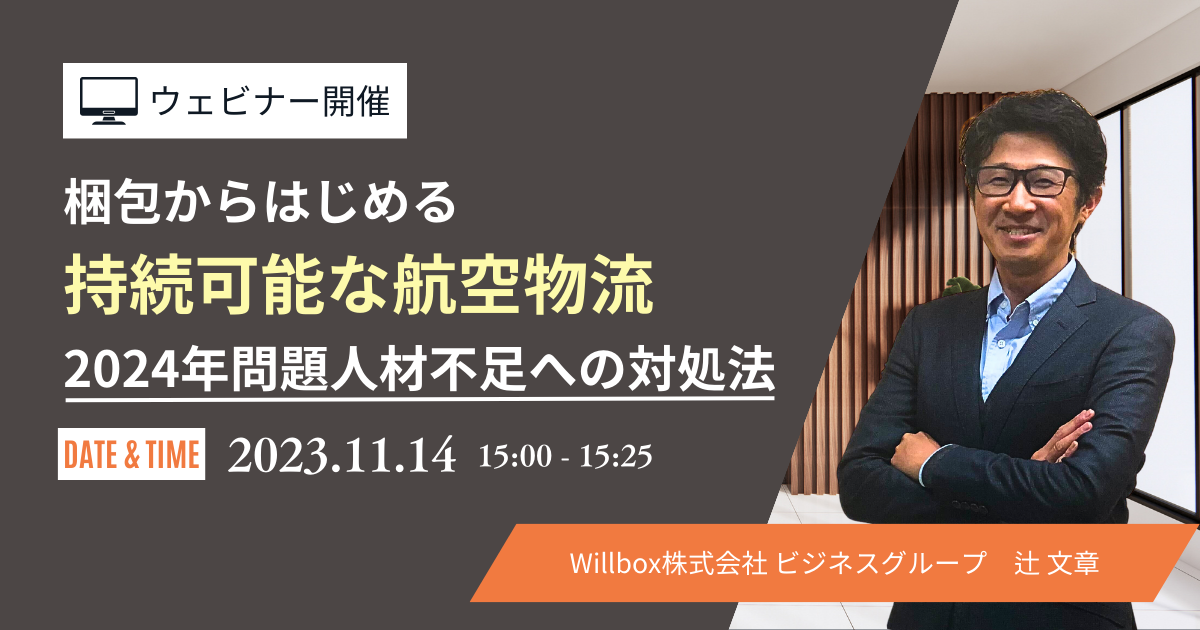 内 容:2024年問題、人材不足、物流費の高騰など航空輸送に関する課題は山積みです。そこで、航空輸送の起点となる”梱包”を軸に航空物流を見直し、Willboxが2024年3月にリリースを予定している新サービス「Giho Air(ギホーエアー)」 を用いて、物流動線の改善やコスト低減、見積りから輸送までの一括管理による工数削減など、課題解決策をお伝えします。