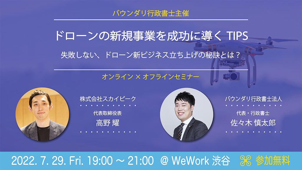 そこで、ドローン法務のプロフェッショナル、バウンダリ行政書士の代表・佐々木慎太郎が、ドローンビジネスのスタートアップ企業として成長を続ける株式会社スカイピーク・高野耀氏を迎えて、ドローンの新規事業立ち上げやスタートアップにおける成功の秘訣をセッション形式で追求していきます。