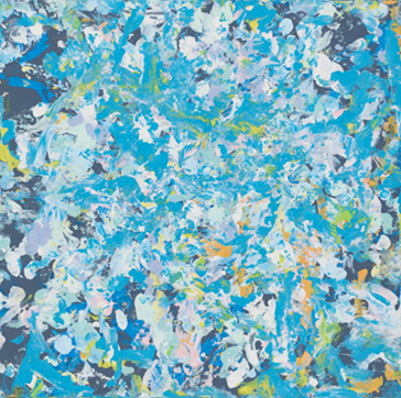 歩くことが大好きで車椅子に座っていても気分が良くなると両足がぴょんぴょんと跳ねてきます。絵画の時間も歩きながら鈴の音がする筆を持って、叩くように時に撫でるように楽しみながら絵を描いています。踊るように描いている様が松本さんの楽しさを連想させ、弾けるタッチで楽しかった思い出が蘇るようです。