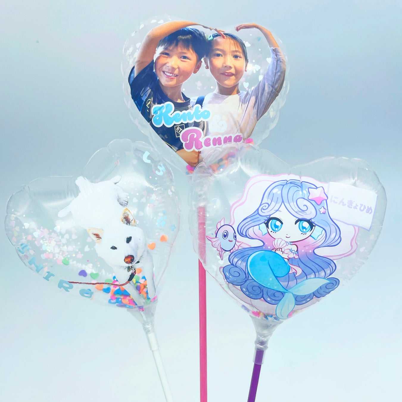 バルーンの形はラウンド・ハート・スターの3種、中に入れるコンフェッティは15種以上、スティックのカラーは10色以上からお選びいただけるので、柄意外の部分でも個性を出すことができます。
