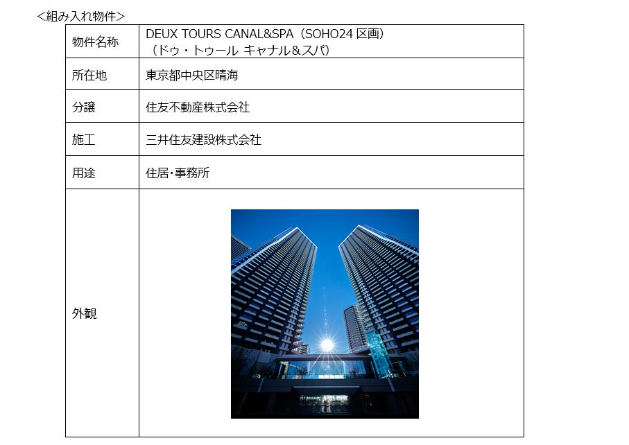 本商品は、中央区晴海に所在するタワーマンションの44階にあるSOHO24区画を投資対象としており、募集金額は1,980百万円となっております。晴海エリアは、東京駅や銀座などへのアクセスも良好であることから買い物や通勤に便利なのはもちろんのこと、教育・医療施設等にも恵まれており、さらなる住環境整備が予定されております。また、2棟のタワーマンションからなる、本商品は、ビジネス環境と居住環境を両立した収益物件としても安定性が高いと見込まれております。