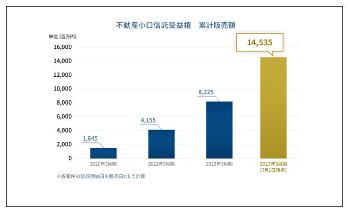 本商品の完売により、当社は、合計9案件、累計14,535百万円の不動産小口信託受益権を販売いたしました。また、お客様の不動産小口信託受益権に対する需要は高く、そのニーズに応えるべく、当社は引き続き新たな商品の販売準備を進め、当社の直営店舗ならびに地域金融機関との共同店舗のお客様の他、提携する税理士事務所・公認会計士事務所等からご紹介いただきましたお客様にご案内をしてまいります。