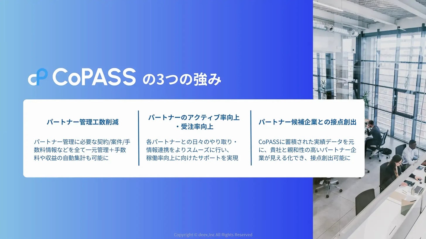 deex株式会社は、「企業が本来持っている可能性を最大化する。そのために、パートナービジネスを再定義する。」をミッションに掲げ、株式会社リクルート/株式会社ワークスアプリケーションズ出身でパートナービジネスに精通したメンバーにより設立されました。代理店チャネルに関する幅広いビジネスを展開し、PRMという概念のもと、メーカー(ベンダー)企業と販売パートナーとの連携を強化・高度化するプラットフォーム「CoPASS(コーパス)」の提供や、代理店戦略/実務までを支援するコンサルティングサービス(Partner Boost)などを行っています。