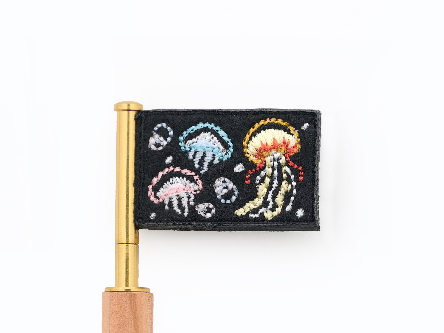 黄褐色の傘に色鮮やかな赤い触手を揺らめかせながら浮遊する大型クラゲのパシフィックシーネットルと、照明演出で色とりどりに光りながら漂う2匹のミズクラゲたちを、小さなフラッグの中にデザインしました。漆黒の静かな空間で浮かび上がるクラゲたちの透き通るような繊細な美しさをとしなやかさを、糸の濃淡や異なるステッチ使いで表現しています。今にも動き出しそうな個性豊かなクラゲたちと一緒に幻想的な海の世界に出かけてみませんか。