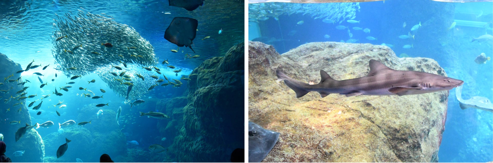 「相模湾大水槽」は、相模湾の環境をできるだけありのままに再現した、新江ノ島水族館内で最大規模の水槽です。相模湾を代表する魚種の一つ、マイワシ約 8,000 匹の群泳をはじめ、100種約20,000匹の生き物たちを岩礁や沖合のようすなどさまざまな角度から観察することができます。