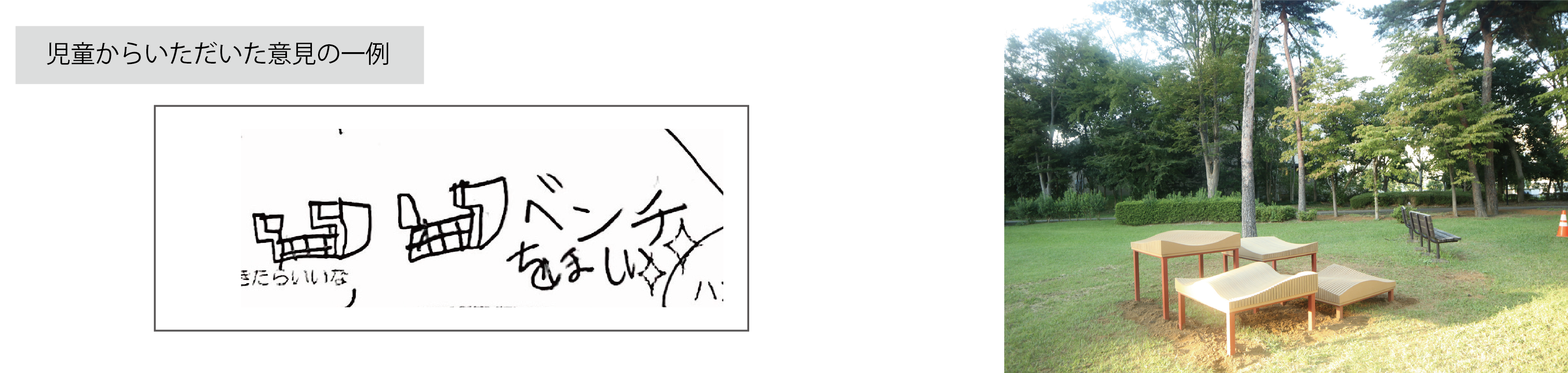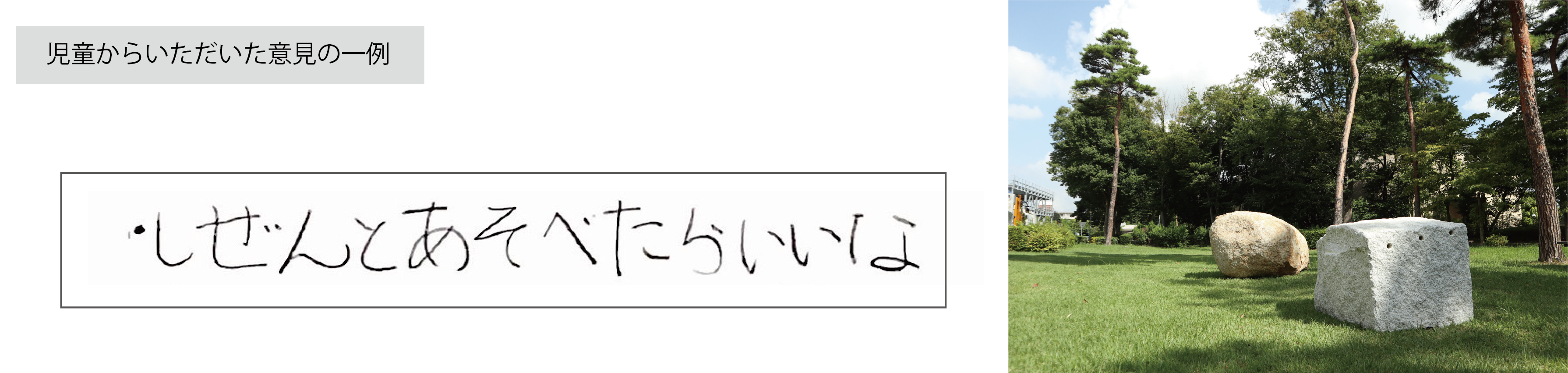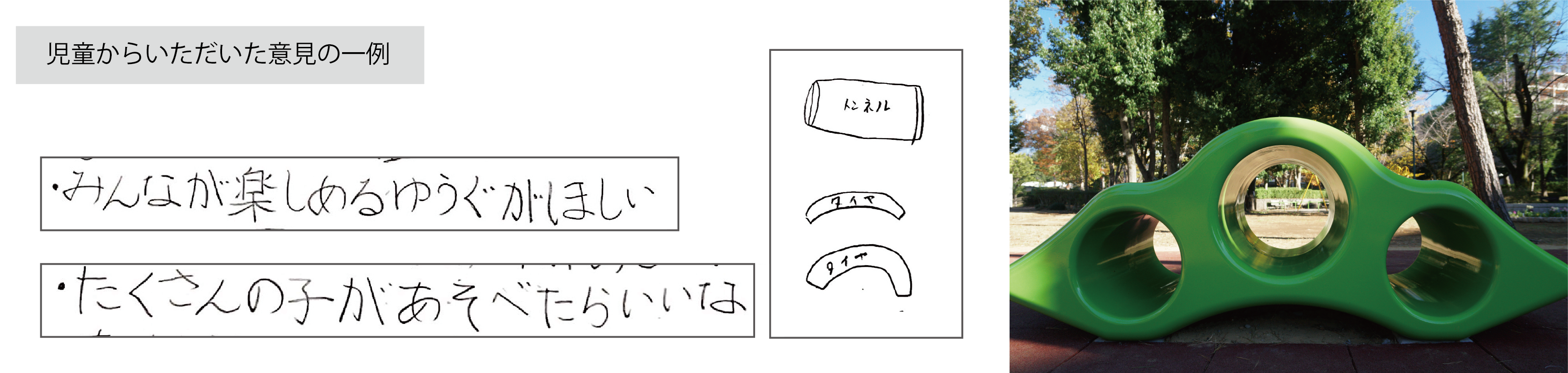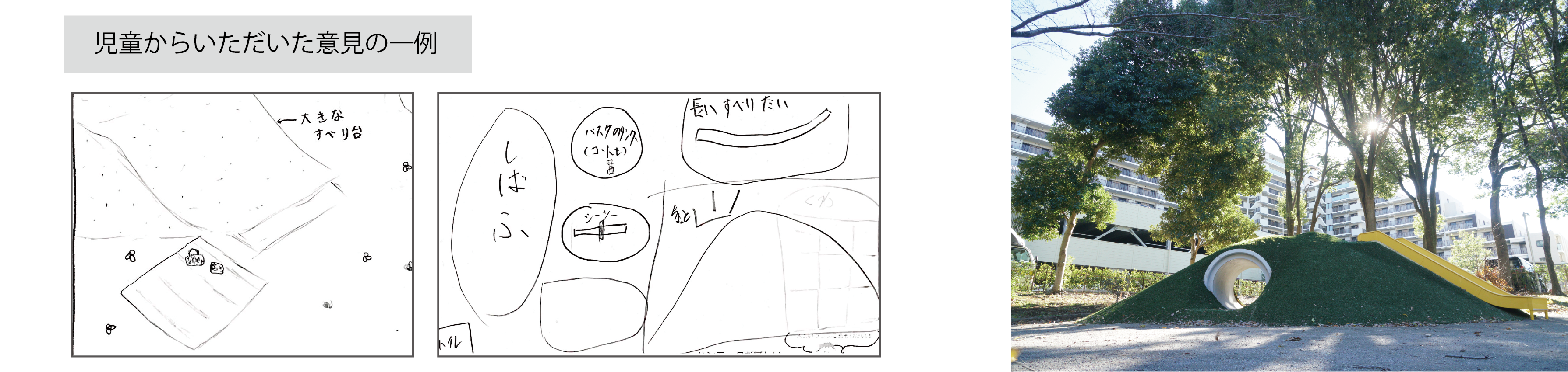 実際に公園を使うこどもの意⾒を反映するため、こどもが欲しい公園をイラスト・⾃由記述で伺う