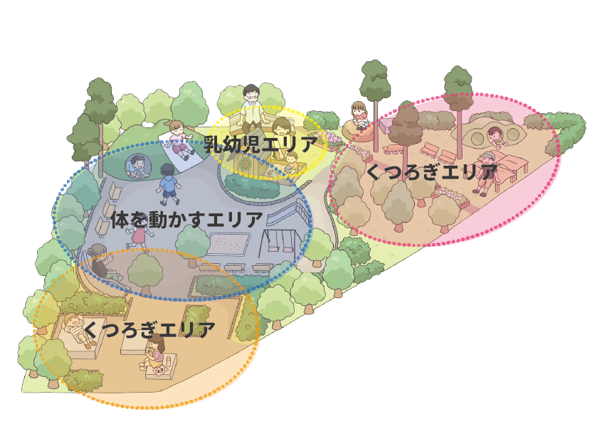 誰もが安全に楽しく遊びくつろげるよう、公園を4つのエリアにゾーニング