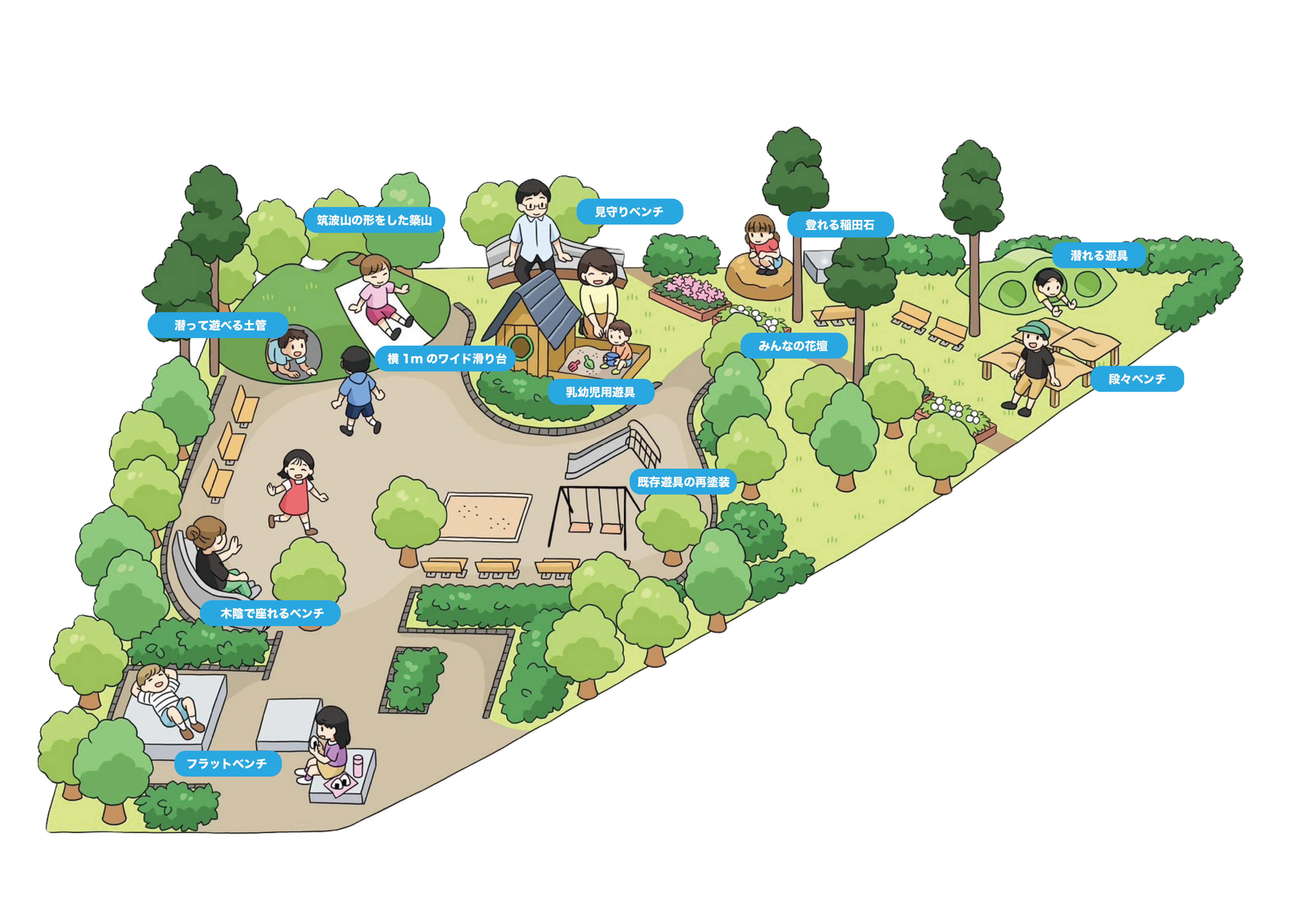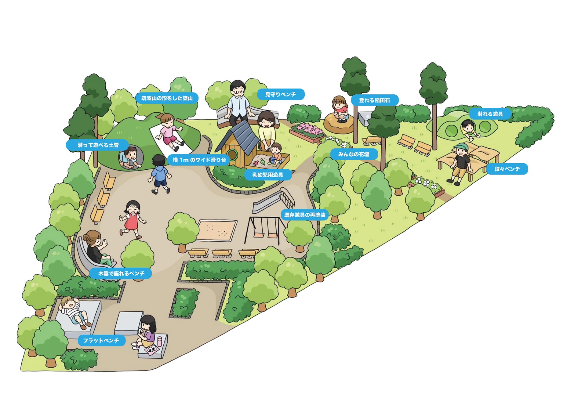 筑波山を模した山を作り、山頂からはすべり台、中腹には山を横切る土管を設置。