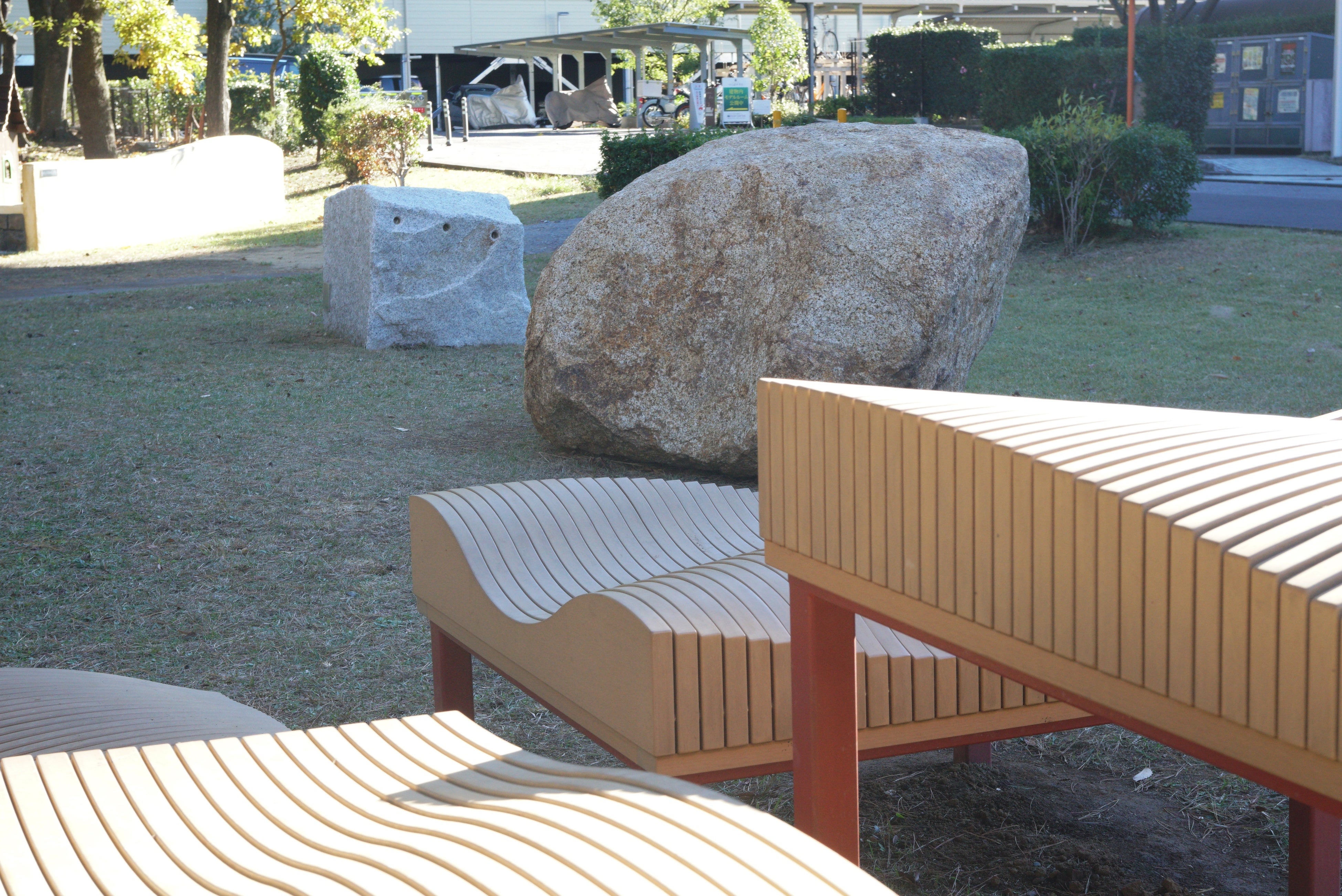 こどもからの意⾒を踏まえ、家でなく外でゲームやカードゲームができる環境整備を考え、変わった形のベンチを設置。カーブは「正弦波(サインカーブ)」。
