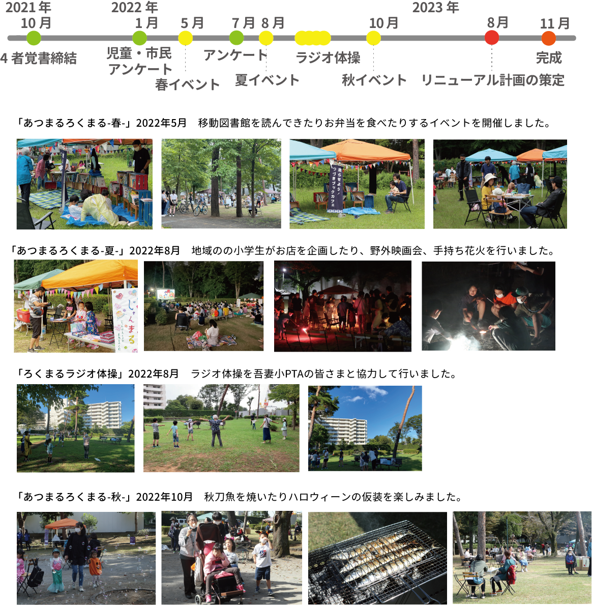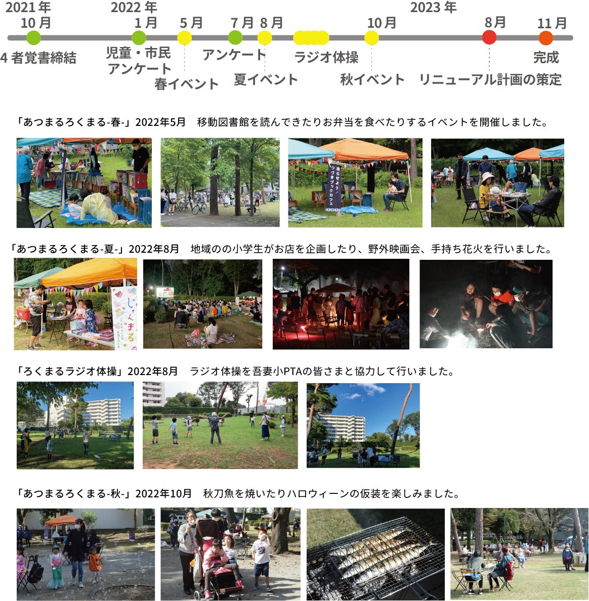 ろくまる公園のような街区公園は、地域のコミュニティの中心となる場所であるため、地域の方が自ら公園を使い、集える場にしていくことが重要です。本事業では公園のリニューアルの前から、地域の方を巻き込んだイベントを4回実施し、コミュニティ形成のきっかけづくりを行いました。