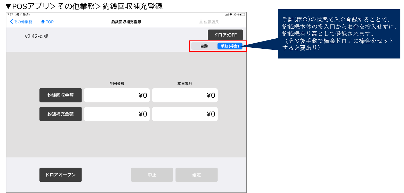 自動釣銭機(RT/RAD-300)連携時に棒金ドロア接続している場合、棒金ドロアへのつり銭準備金入金登録ができるようになりました。