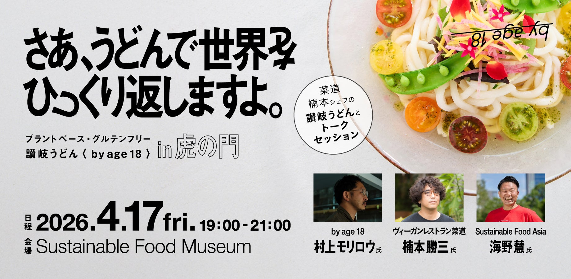 うどん県⺠ 10,000 ⼈以上が訪れ、昨年マレーシアに2号店もオープンした⾹川県のプラントベース・グルテンフリーうどんレストラン「by age 18」が、2026年4月17日(金)⻁ノ⾨で 1 ⽇限定イベントを開催します。