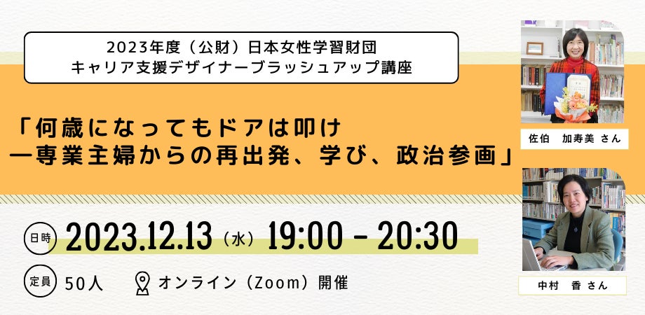 オンライン開催!女性のキャリア形成支援のヒントを得られる講座「何歳になってもドアは叩け―専業主婦からの再出発、学び、政治参画」を12月13日(水)に開催!