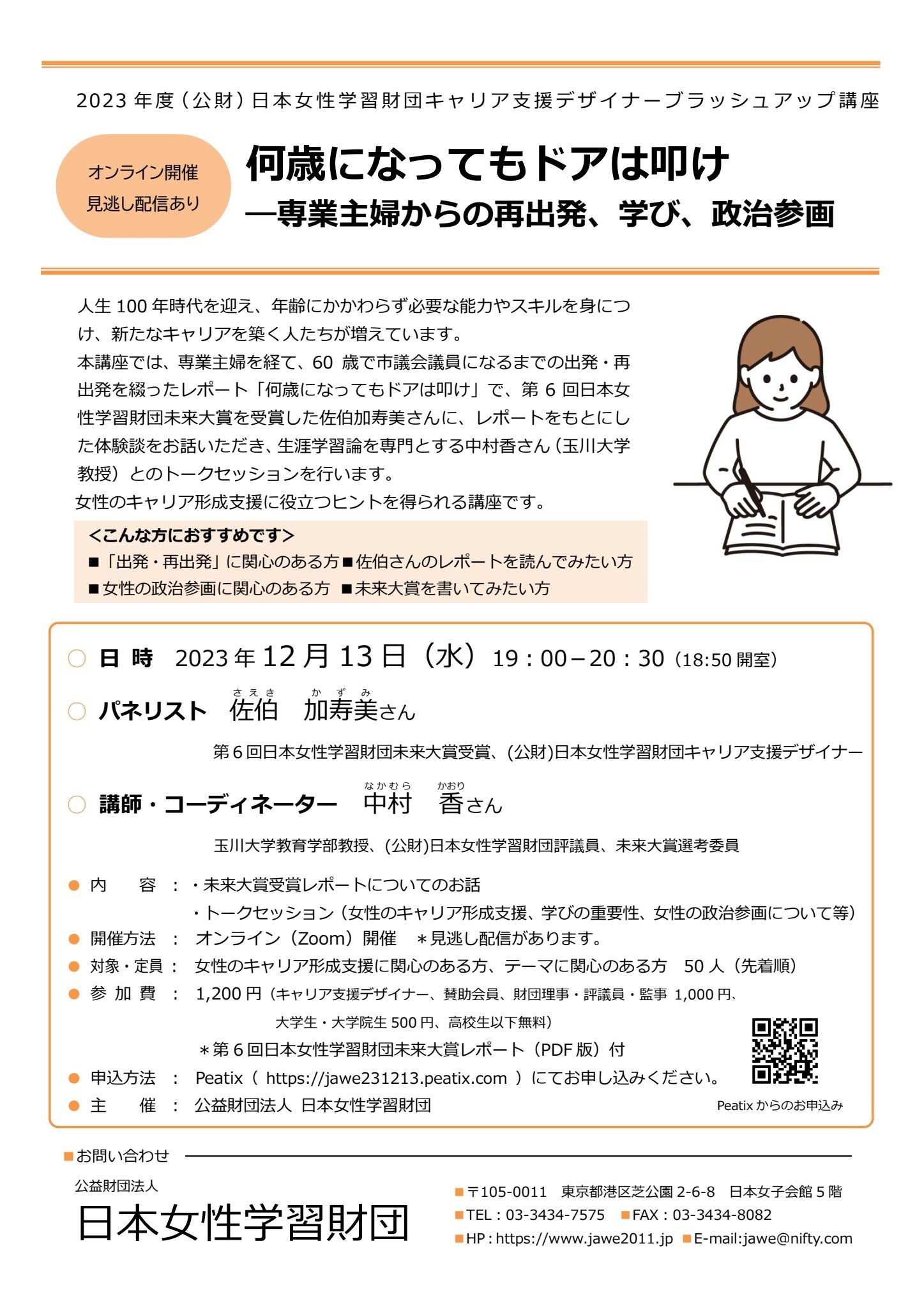 2023年度(公財)日本女性学習財団キャリア支援デザイナーブラッシュアップ講座(2023年12月13日19時~、オンライン開催、見逃し配信あり)