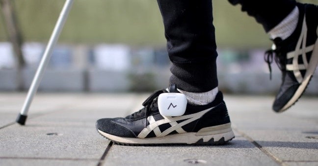 ご自身の靴に装着したデバイスにより、靴の中への振動を与えます。この振動により、視覚障がい者にとって大切な聴覚や白杖操作などを邪魔せずに誘導していきます。