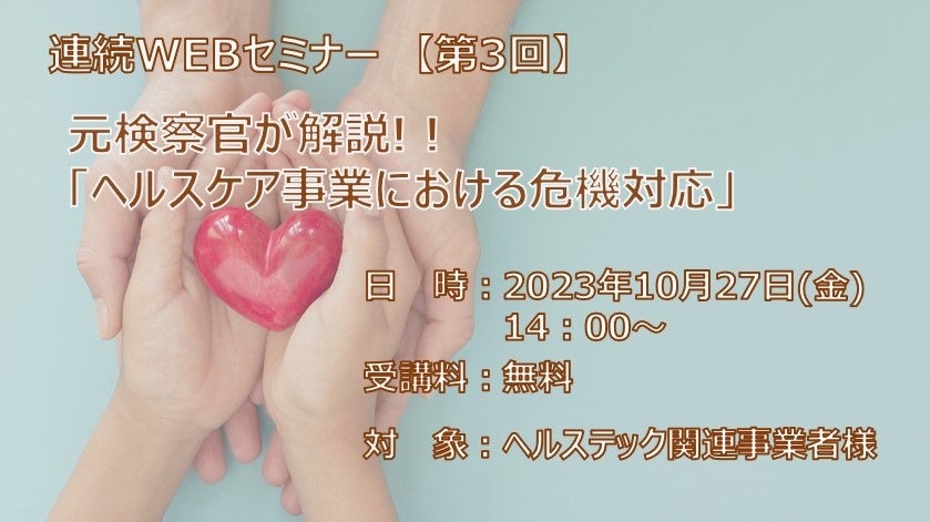 ※ヘルステック関連事業者様対象※【2023年10月27日開催】連続WEBセミナー◇第3回 元検察官が解説! ! 「ヘルスケア事業における危機対応」◇
