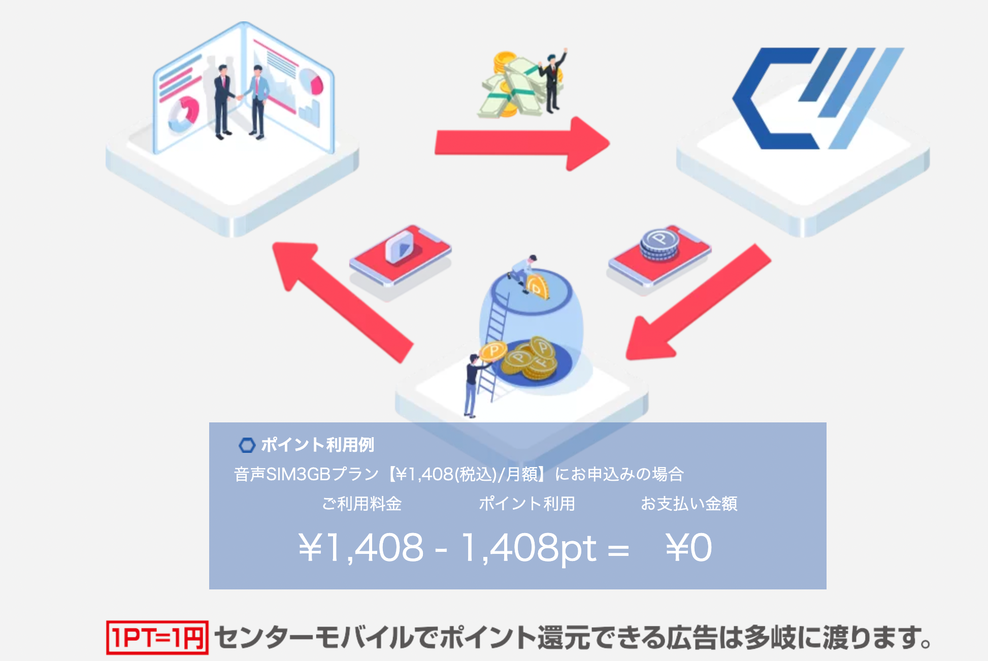 ユーザーが獲得したポイントは、月々の携帯料金に充当することができ、ポイントの充当により「最大0円まで割引」できる広告収益還元モデルを採用しています。