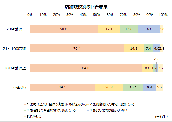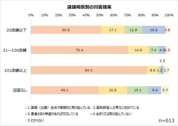 「『かかりつけ薬剤師』に積極的に取り組んでいる」 との回答は下記の通り店舗規模ごとに異なる結果 20店舗以下 50.8% 21~100店舗 70.4% 101店舗以上 84.0%