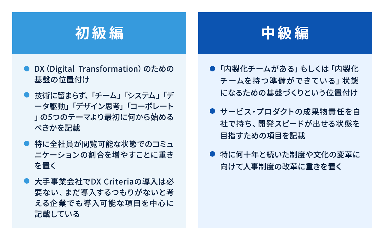 ・大手事業会社でDX Criteriaの導入は必要ない、まだ導入するつもりがないと考える企業でも導入可能な項目を中心に記載している
