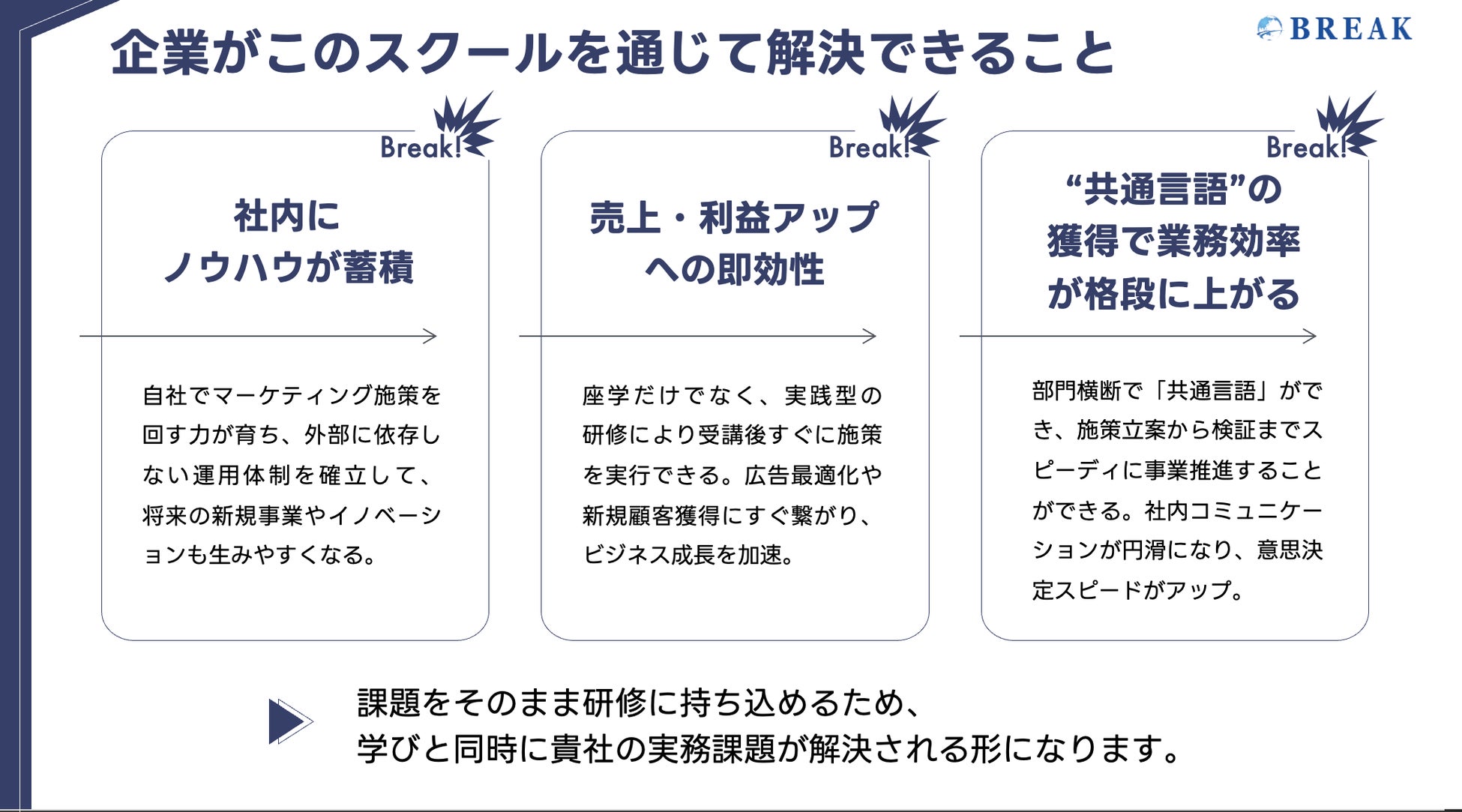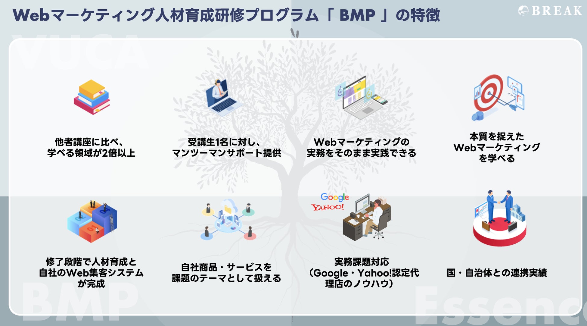 株式会社ブレイク(代表取締役 小川佳祐/本社:大阪/)は、法人向けWebマーケティング人材育成研修「Break Marketing Program(BMP)」を5社限定・無償で受講できるモニター企業の募集を開始いたします。本プログラムは受講者累計2,500名を超え、Webマーケ講座3部門でNo.1を獲得※1。