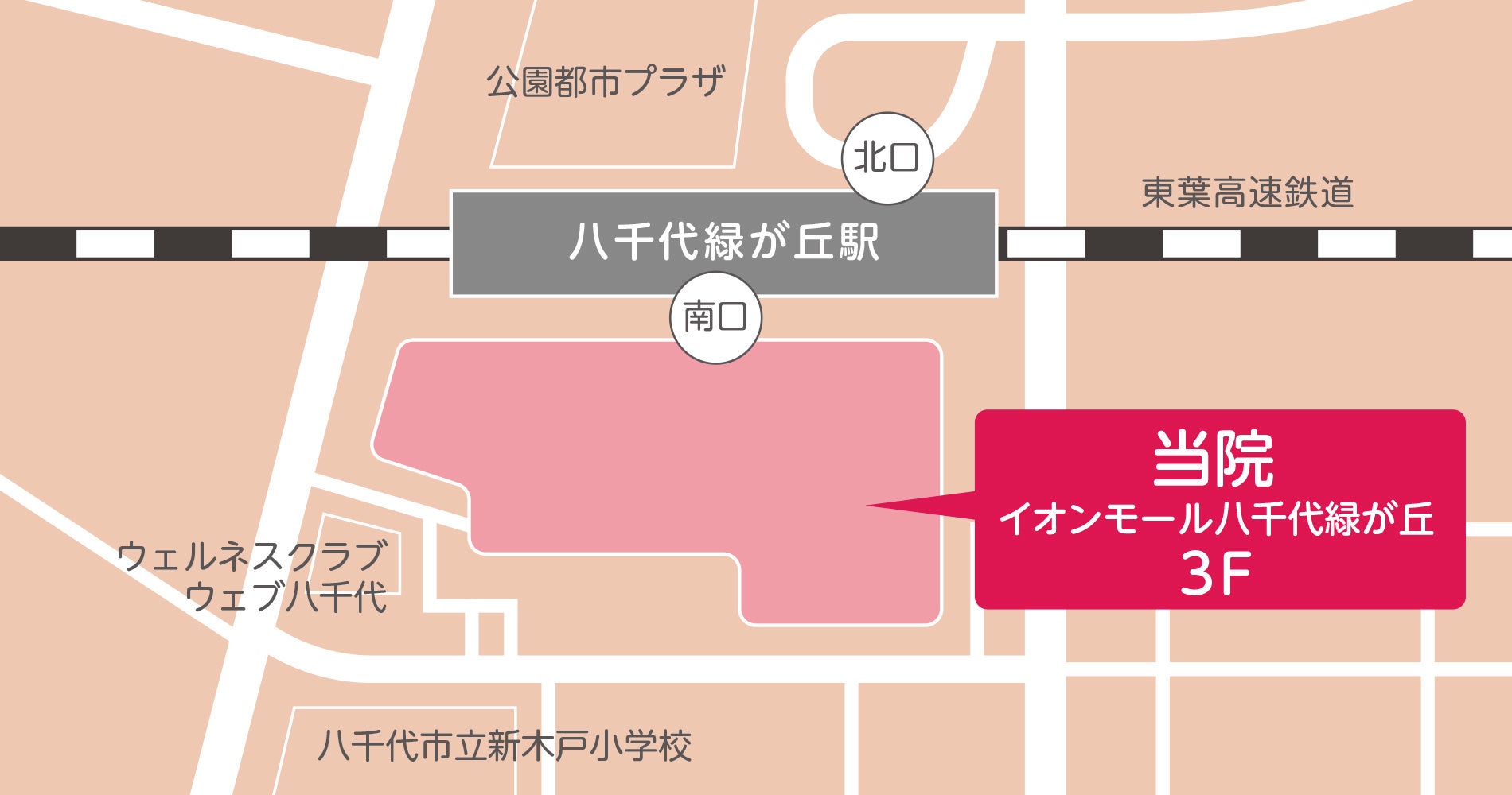 東葉高速鉄道 八千代緑が丘駅南口から直結の「イオンモール八千代緑が丘」3階で、朝9時から夜21時まで、土日祝日も毎日診療を行います。