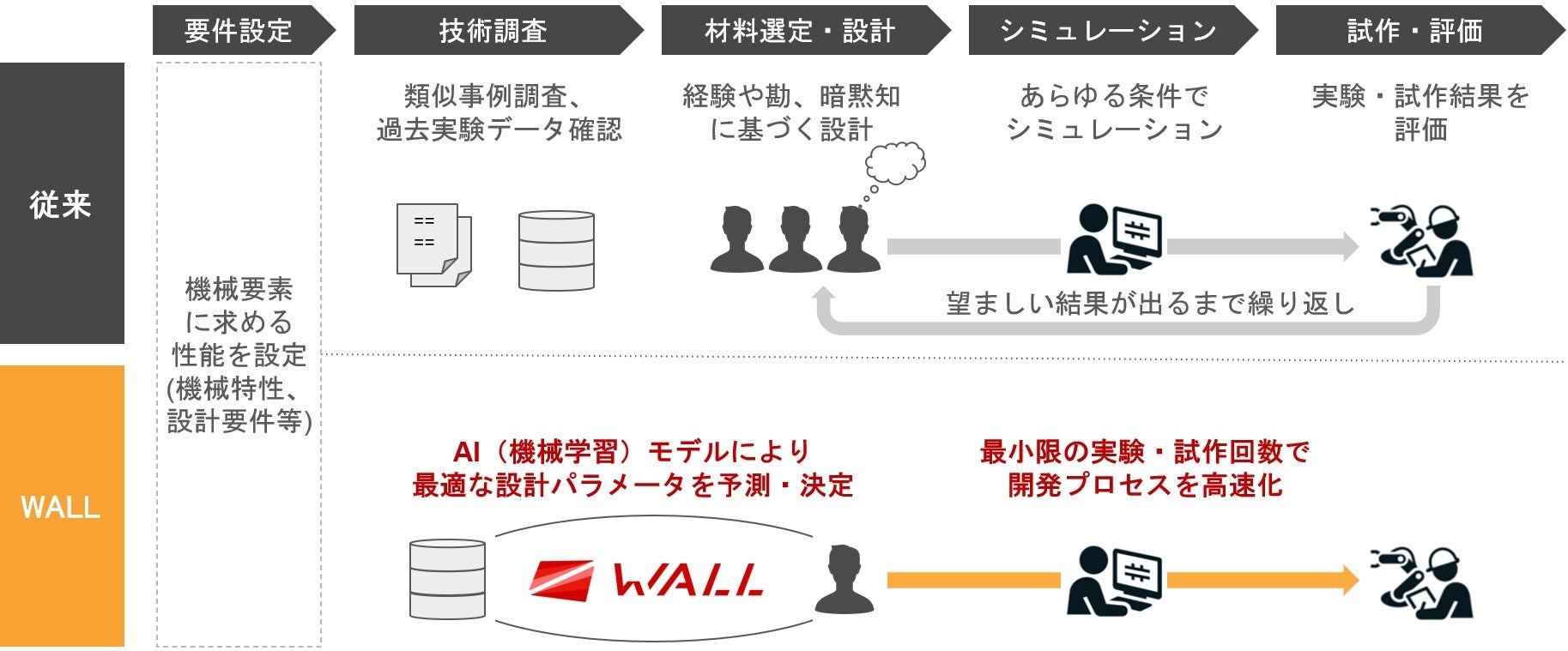 『WALL』は、最新のインフォマティクス技術を製造業の研究開発や設計業務に適用し、高速で最適なパラメータの提案を可能にしたプラットフォームです。