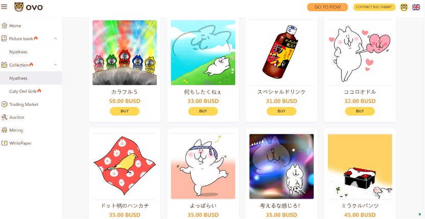OVOはホログラフィックAR技術を融合させたNFT発行、取引等のサービスを提供するプラットフォームである。人気LINEスタンプのにゃっちーず(Nyathees: トランザクション数10万以上、累計総販売個数6万以上)NFTを発行したことで一躍有名になった。