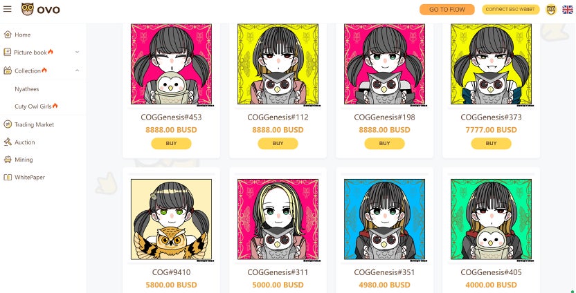 例えばOVOで発行しているおにぎりまん(https://twitter.com/onigiriman1998?s=21&t=Ox7Ujxje-z1uf4c6_Mcb7g)さん描き下ろしの「Cuty Owl Girls(COG)」NFTアバターは高額で取引されている。恐らく、NFTに馴染みのない人には理解しがたい現象に見えるかもしれない。