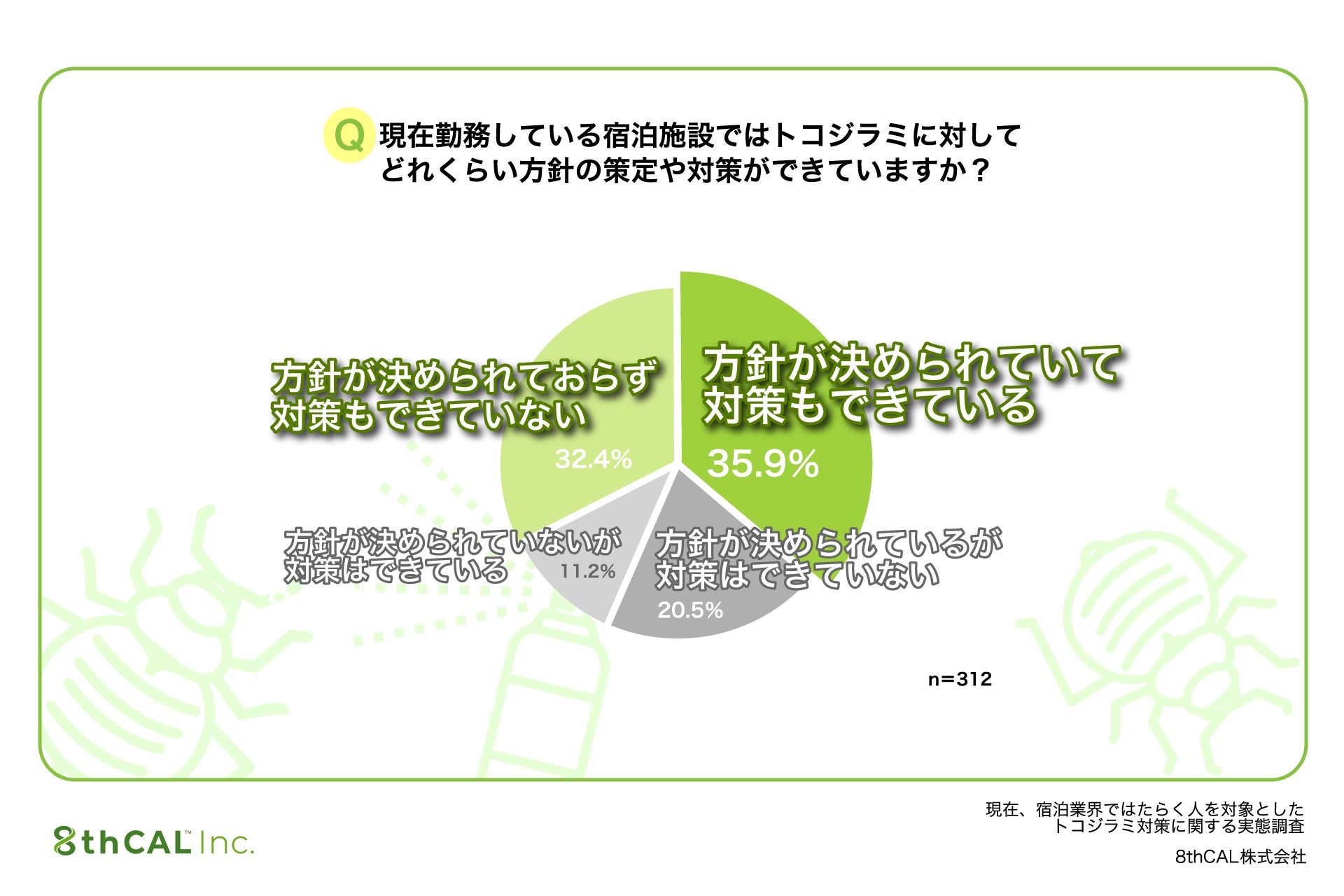 まず「現在勤務している宿泊施設では、トコジラミに対してどのくらい方針の策定や対策ができていますか?」といった質問では、「方針が決められていて、対策もできている」と答えた人が35.9%という結果となりました。