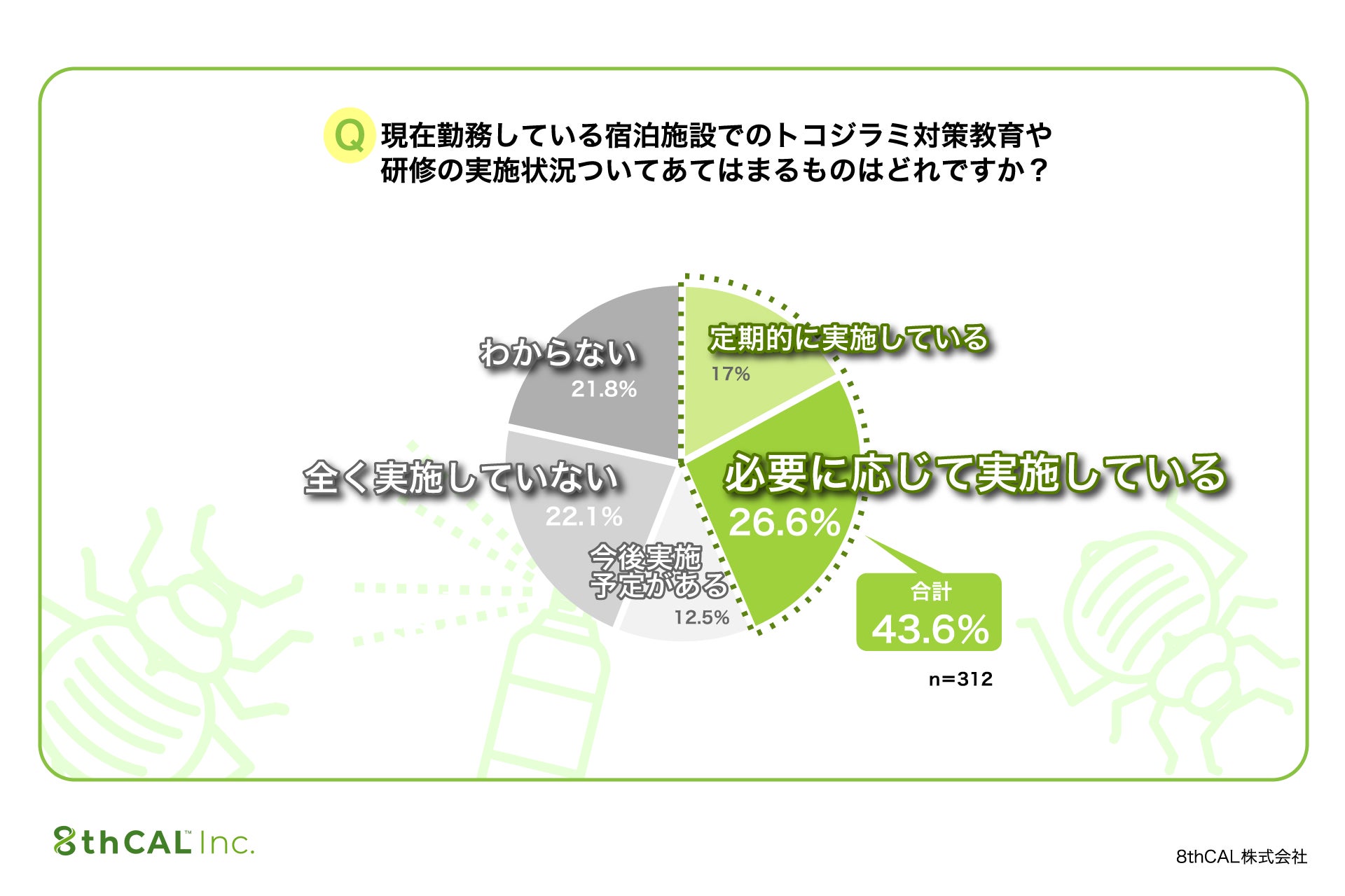 【宿泊業界ではたらく人を対象としたトコジラミ対策に関する実態調査】 現在、トコジラミ対策教育を”実施できている”のは「43.6%」 ”全く実施できていない”は「22.1%」という結果に