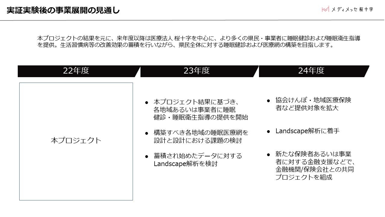 厚生労働省の研究班の発表によりますと、日本人の5人に1人が「睡眠で休養が取れていない」、「何らかの不眠がある」と回答しています。加齢とともに不眠は増加し、60歳以上の方では約3人に一人が睡眠問題で悩んでいます。そのため通院している方の20人に1人が不眠のため睡眠薬を服用している患者も多く存在します。睡眠時間には個人差があり、3時間程度で間に合っている人もいれば、7時間ほどで十分という人、10時間ほど必要とする人までさまざまです。しかし、健康な人でも年齢とともに中途覚醒や早朝覚醒が増えてきます。こうした実態を熊本県内でも明らかにしていくことによって、県民の不眠症の早期スクリーニングによって、重症化を防ぐことが必要です。東京大学大学院医学系研究科で6年強研究されてきた世界最高精度の睡眠測定技術を活用し、熊本県内事業所に所属する従業員の健康改善に寄与するシステムの実用化を目指します。また、10月に開業予定のメディメッセ桜十字を拠点として、本事業を実施し、その後は、九州、そして全国へと拡充して参ります。