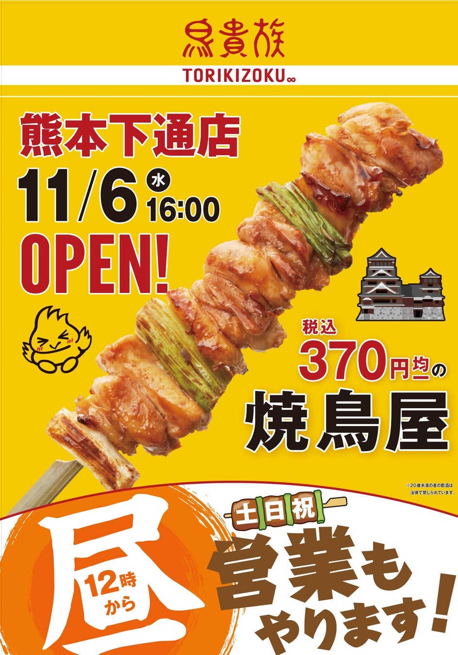 株式会社エターナルホスピタリティグループ傘下の株式会社鳥貴族(本社:大阪市浪速区 代表取締役社長:江野澤暢男)が運営する税込370円均一の焼鳥屋「鳥貴族」は、熊本県で初出店となる、熊本下通店(運営元:株式会社ウィン)を11月6日(水)にオープンいたします。