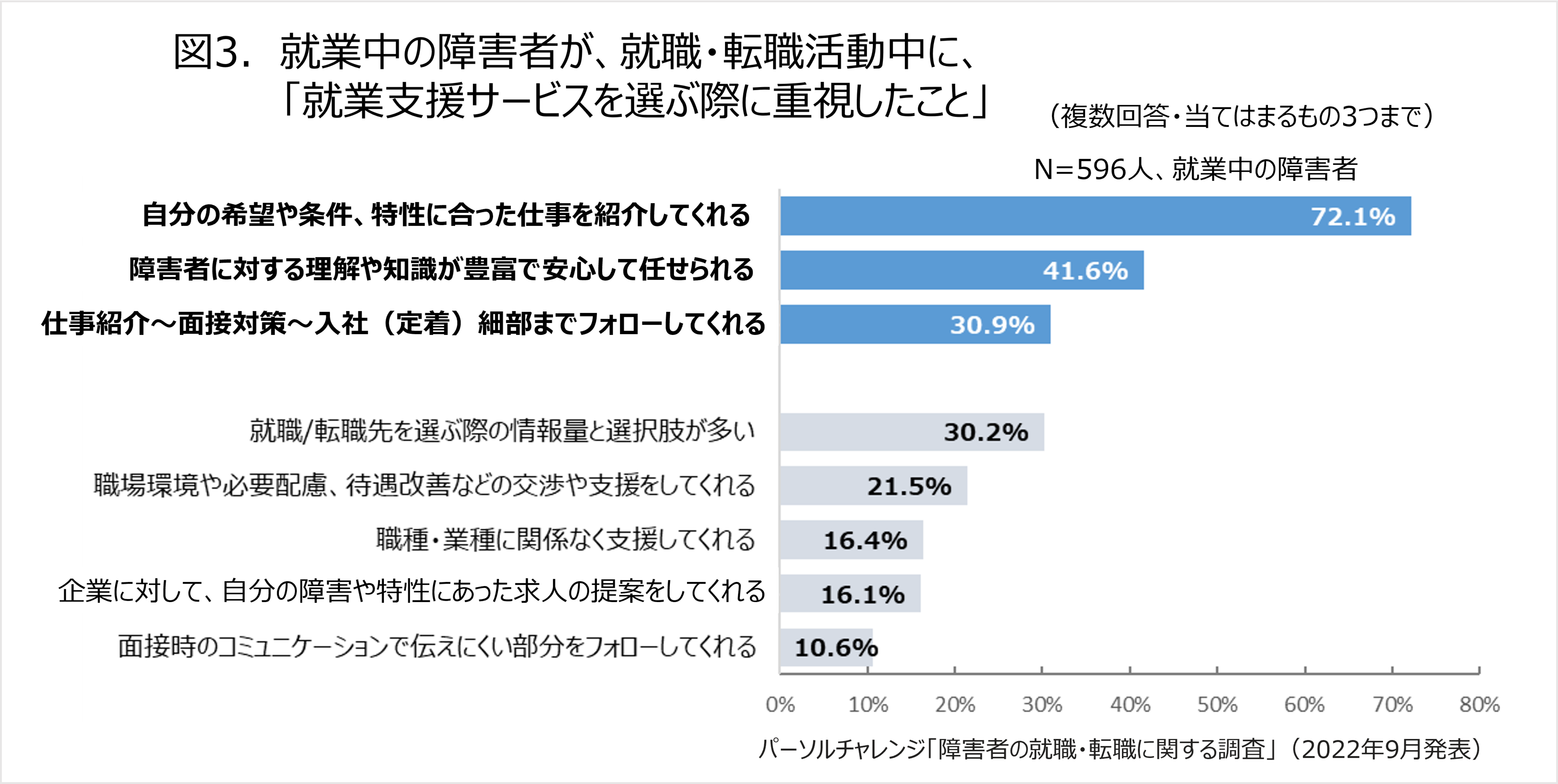 最後に、障害のある就業中の方が、「就職・転職活動を行う際に、支援サービスに期待したことや望んだこと」を尋ねると、1位の「自分の希望や条件、特性に合った仕事を紹介してくれる」(72.1%)以外では、「障害者に対する理解や知識が豊富で安心して任せられる」(41.6%)、「仕事紹介~面接対策~入社後(定着)など細部までフォローしてくれる」(30.9%)、「就職/転職先を選ぶ際の情報量と選択肢が多い」(30.2%)などの回答数が多く集まりました。
