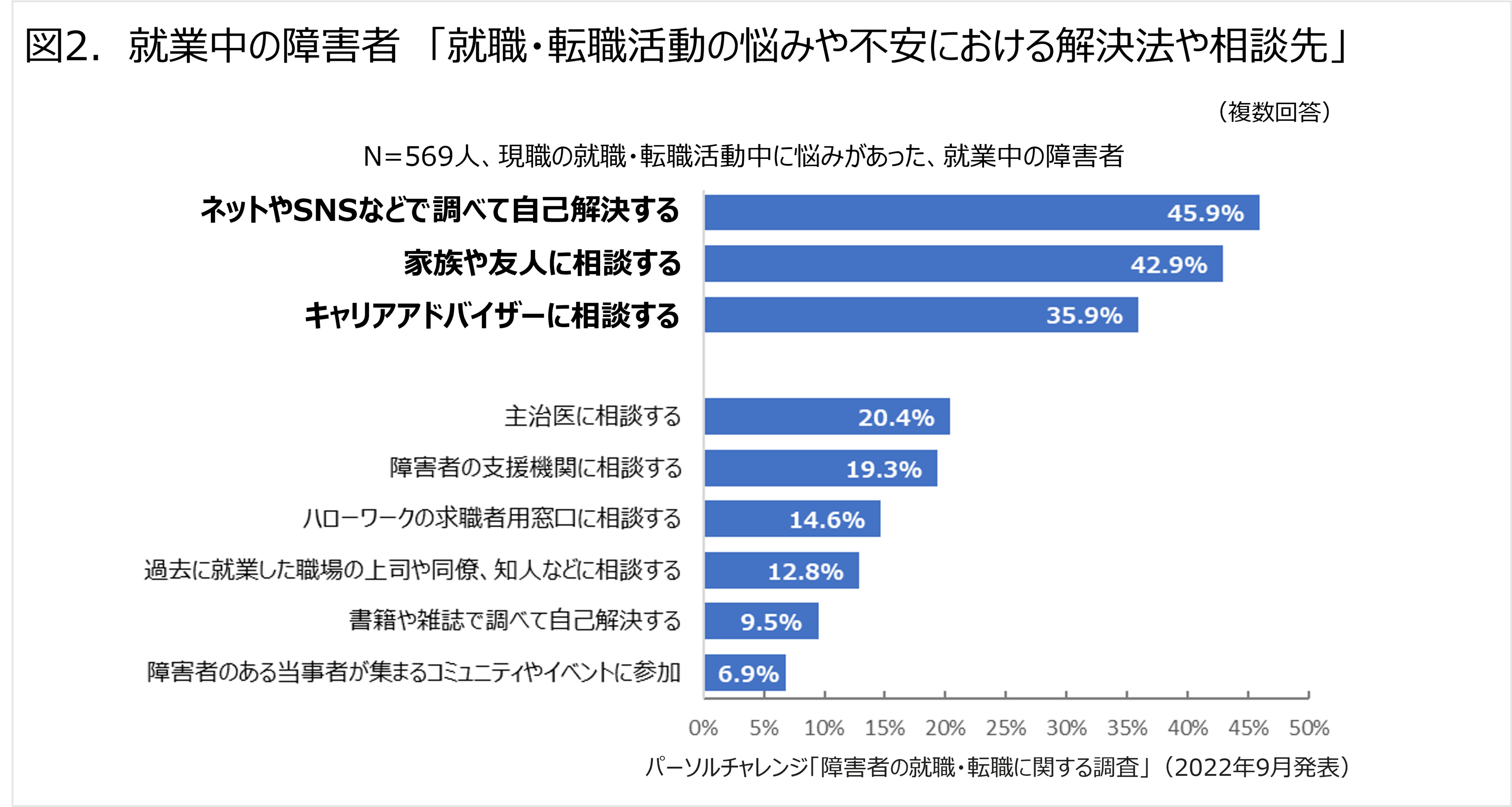 ・「就職・転職活動中における不安や悩みの解消法や相談先」は、1位「ネットやSNSなどで調べて自己解決」、2位「家族や友人に相談」、3位「キャリアアドバイザーに相談」。「障害者の支援機関」や「ハローワークの求職者窓口」に相談する人は2割に満たず【図2】。