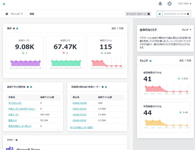 PI は、使用中の Microsoft Teams のチーム・Microsoft 365 グループ・SharePoint のサイト・ OneDrive のセキュリティ状態を可視化します。ルールや権限の制御レベルを選択・設定し、リスクを定義することにより、ポリシーを自動適用することが可能です。